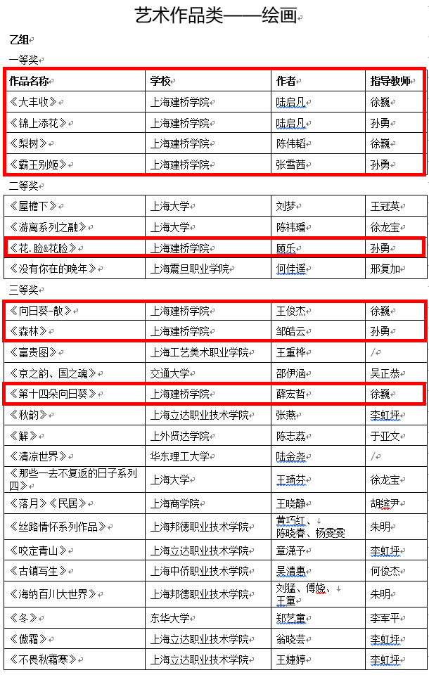 在2017年5月-12月举行的全国第五届大学生艺术展演上海市活动中,我校艺术作品类、艺术表演类项目中共获奖13项,其中艺术设计学院徐巍、孙勇老师指导的4幅学生作品包揽了艺术作品绘画类别乙组(专业类)全部一等奖项。《大丰收》陆启凡《锦上添花》陆启凡《梨树》陈伟韬《霸王别姬》张雪茜《花.脸花脸》顾乐《向日葵-散》王俊杰《森林》邹皓云《第十四朵向日葵》王俊杰据悉,本届大学生艺术展览以“理想与信念”为主题,展演活动的项目分为艺术表演类、大学生艺术实践工作坊、艺术作品类(含学生艺术作品和高校校长书画摄影作品)、高校艺术教育科研论文报告会四大类。艺术表演类包括声乐、器乐、舞蹈、戏剧和朗诵;学生艺术实践工作坊包括艺术与校园、艺术与生活、艺术与科技三部分;学生艺术作品包括绘画、书法、篆刻、摄影、设计、微电影;高校校长书画摄影作品包括绘画、书法、篆刻、摄影。此次艺术展给学生提供了丰富多彩的艺术实践活动,让更多的学生成为艺术展演活动的受益者,在感受美、表现美、鉴赏美、创造美的过程中提高审美和人文素养。
