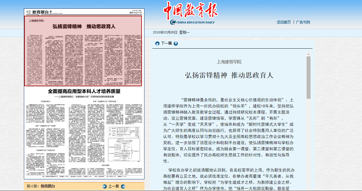 3月5日,在纪念毛泽东主席“向雷锋同志学习”题词55周年,十三届全国人大开幕之际,中国教育报文章《弘扬雷锋精神推动思政育人》《全面提高应用型本科人才培养质量——上海建桥学院以“卓越建桥计划”引领学校改革和转型发展》整版报道我校多年来以弘扬“雷锋精神”为载体,探索创新育人工作成效做法和以“卓越建桥计划”为引领全面提高人才培养质量,实现学校内涵式发展的有效举措。文章概括总结了我校在德育育人工作中取得的成绩和提升应用型本科人才培养的实践探索。《中国教育报》版面文章《弘扬雷锋精神推动思政育人》一文指出,建校18年来,上海建桥学院坚持把弘扬雷锋精神融入教育教学全过程,通过把雷锋精神融入课堂主渠道,与“感恩、回报、爱心、责任”校训紧密结合;把雷锋精神融入主题教育活动,与践行社会主义核心价值观紧密结合;把雷锋精神融入师生激励评价形成长效制度,与营造建桥校园文化紧密结合,推动思政育人工作成效显著。文章还指出,特别是学校以学习贯彻十九大及全国高校思想政治工作会议精神为契机,进一步加强了顶层设计和机制平台建设,使弘扬雷锋精神与学校办学定位、育人目标紧密结合,成为融合第一课堂、第二课堂和第三课堂的有效载体,