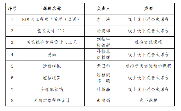 近日,上海市教委发布了《上海市教育委员会关于公布2023年度上海高校市级一流本科课程认定结果的通知》(沪教委高〔2024〕2号),上海建桥学院推荐的《BIM与工程项目管理(双语)》等8门课程被认定为上海市一流本科课程,其中,虚拟仿真实验教学课程首次获批。表2023年度上海高校市级一流本科课程获批一览表序号课程名称负责人类型1BIM与工程项目管理(双语)李 培线上线下混合式课程2包装设计(1)汤美娜线上线下混合式课程3首饰综合材料设计与工艺刘衔宇张锦彩社会实践课程4漫画孙修恩徐哲晖线上线下混合式课程5沙盘模拟尹卫华虚拟仿真实验教学课程6虚拟现实矫桂娥祁 曦线上线下混合式课程7全媒体营销叶晶晶线上线下混合式课程8面向对象程序设计朱丽娟线下课程截至目前,我校有上海市一流本科课程19门,这些课程无论在教学目标、教学内容,还是在教学方法、评价考核等方面,都体现出了高阶性、创新性和挑战度,为我校培养应用型人才提供了有力支撑。 我校将继续推进各类课程的教学改革,进一步创新人才培养机制,持续加大一流本科课程建设力度,并充分发挥其示范引领作用,树立课程建设新理念,推进课程改革创新,从而进一步提升我校本