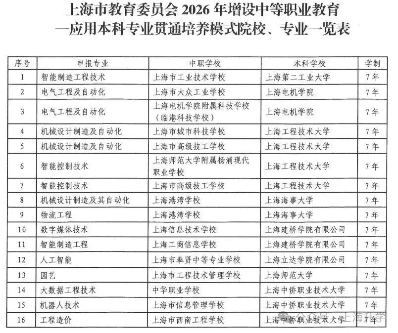 近日,上海市教委发布《上海市教育委员会关于2026年增设中等职业教育—应用本科专业贯通培养模式工作的批复》(沪教委职〔2025〕22号)及《上海市教育委员会关于2026年增设中高职教育贯通培养模式工作的批复》(沪教委职〔2025〕23号)。上海2026年中考将增设16个中本贯通专业点、40个中高贯通专业点。在这一批新增试点专业名单中,上海建桥学院与两所中职学校联合申报的两个中本贯通专业成功获批。上海建桥学院与上海信息技术学校联合开设数字媒体技术专业。该专业依托知名数字虚拟开发企业,构建产学研为一体的优质人才培养平台,培养适应经济社会发展和产业结构调整需求的高素质应用技术型人才,该专业使学生系统掌握数字媒体技术相关的专业知识,能够在虚拟现实与数字交互相关领域,从事数字内容设计、开发工作。上海建桥学院与上海工商信息学校联合开设智能制造工程专业。专业面向长三角先进制造产业集群智能化升级需求,以机器人技术、机器视觉技术和人工智能技术的融合应用为核心方向。培养掌握智能制造领域必需的基础理论和专业知识,精通数字化设计、智能传感控制、工业数据分析等关键技能,并在机器人系统集成、视觉系统开发、AI优化