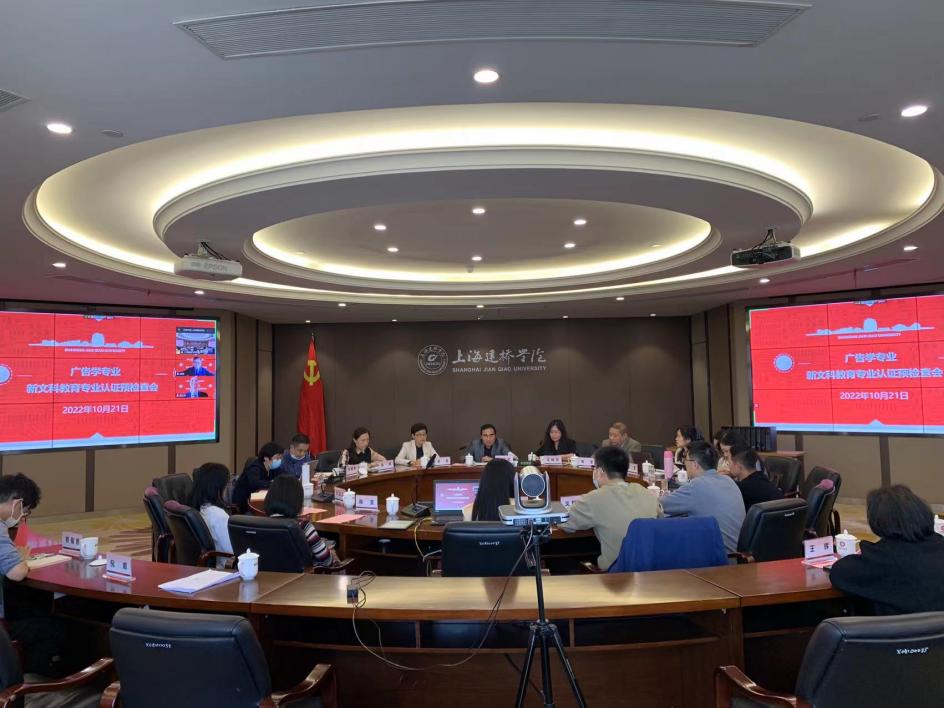 2022年10月21日,上海建桥学院新闻传播学院广告学专业在行政楼M612接受长三角新文科教育专业认证联盟开展的专业认证预检查。预检查专家组由东华大学姚卫新教授和上海大学郜明教授组成,姚卫新教授任组长。上海建桥学院副校长杨俊和、教务处处长杨茉、副处长朱霞、新闻传播学院领导班子、学院办公室、广告学专业系主任、骨干教师、辅导员等参加了认证预检查会议。会议由新闻传播学院院长王梅芳教授主持。杨俊和副校长首先对两位专家表示欢迎与感谢。接着介绍了上海建桥学院的发展历程与办学定位,希望专家组对广告学专业的新文科认证材料及其相关工作提出意见和建议。姚卫新教授和郜明教授介绍了新文科教育专业认证所开展的工作及本次预检查的目的。广告学系主任鄢霞老师汇报了新文科认证工作的准备情况。专家组对专业负责人和2门核心课程负责人进行了现场访谈,针对专业认证相关材料提出了问题,最后给出了具体详实的意见和建议。新闻传播学院王梅芳院长针对专家提出的问题和建议,做了表态发言。她对本次预评审的专家表示感谢,并表示这是一次高质量的专业培训。学院将根据专家组的反馈意见与建议,尽快对问题进行深入系统梳理,进一步修改完善广告学专业认证的