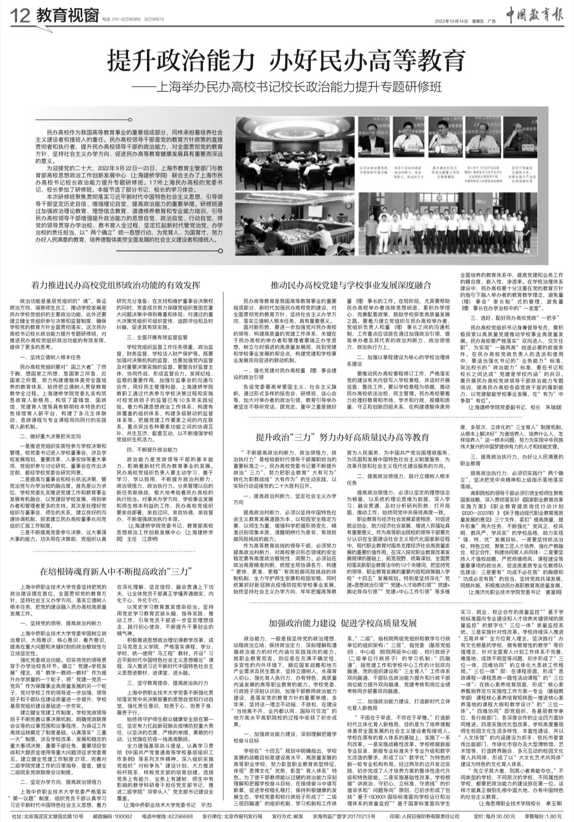民办高校作为我国高等教育事业的重要组成部分,同样承担着培养社会主义建设者和接班人的重任。民办高校领导干部是党的教育方针政策的直接贯彻者和执行者,提升民办高校领导干部的政治能力,对全面贯彻党的教育方针、坚持社会主义办学方向、促进民办高等教育健康发展具有重要而深远的意义。为迎接党的二十大,2022年9月22日—23日,上海市教育主管部门与教育部高校思想政治工作创新发展中心(上海建桥学院)联合主办了上海市民办高校书记校长政治能力提升专题研修班。17所上海民办高校的党委书记、校长参加了研修班。本版节选了部分书记、校长的学习体会。本次研修班聚焦贯彻落实习近平新时代中国特色社会主义思想,引导领导干部坚定历史自信、增强理论自觉、提高政治能力的重要举措。研修班通过加强政治理论教育、理想信念教育、道德修养教育和专业能力培训,引导民办高校领导干部增强提升政治能力的思想自觉、政治自觉、行动自觉,将党的领导贯穿办学治校、教书育人全过程,坚定扛起新时代管党治党、办学治校的责任担当,以“两个确立”统一思想行动,为党育人、为国育才,努力办好人民满意的教育,培养德智体美劳全面发展的社会主义建设者和接班人。着力推进民办