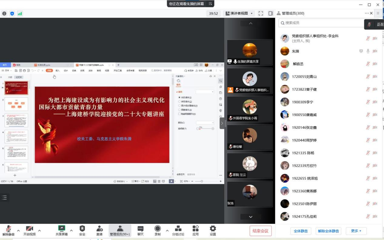 9月6日下午,上海建桥学院于线上举行学习宣传贯彻市第十二次党代会精神专题讲座,上海建桥学院关工委成员、马克思主义学院朱漪教授主讲本次讲座,作“为把上海建设成为有影响力的社会主义现代化国际大都市贡献青春力量”主题报告,为本校学生党员讲解上海市第十二次党代会精神,引导学生党员深刻认识党的二十大的重要意义,以实际行动迎接党的二十大胜利召开。讲座伊始,朱漪教授通过一系列的视频、新闻报道和数据,鲜明地展示了党的十八大以来,上海在经济、政治、文化、党建方面的重大成就。重点从“了解报告的起草过程”“认识报告的鲜明特征”“领会报告的主要精神”“落实报告的重大任务”四个方面,为学生党员介绍了中共上海市第十二次党代会的概况,以及近年来上海发展中取得的成绩、不足以及上海未来发展的新机遇。同时,榜样的力量是无穷的。朱教授通过讲解杨山巍和黄文秀两个榜样人物的感人事迹,引导学生党员们争当有理想信念、有爱心、有事业心、有道德支撑、有冲天干劲的中共党员。在讲座的最后,朱教授强调:党的二十大的重要性在于确定强起来的大政方针,确立坚强的政治领导核心。开启未来十年真正强起来的黄金十年,是中华民族伟大复兴的关键一步。同学们要
