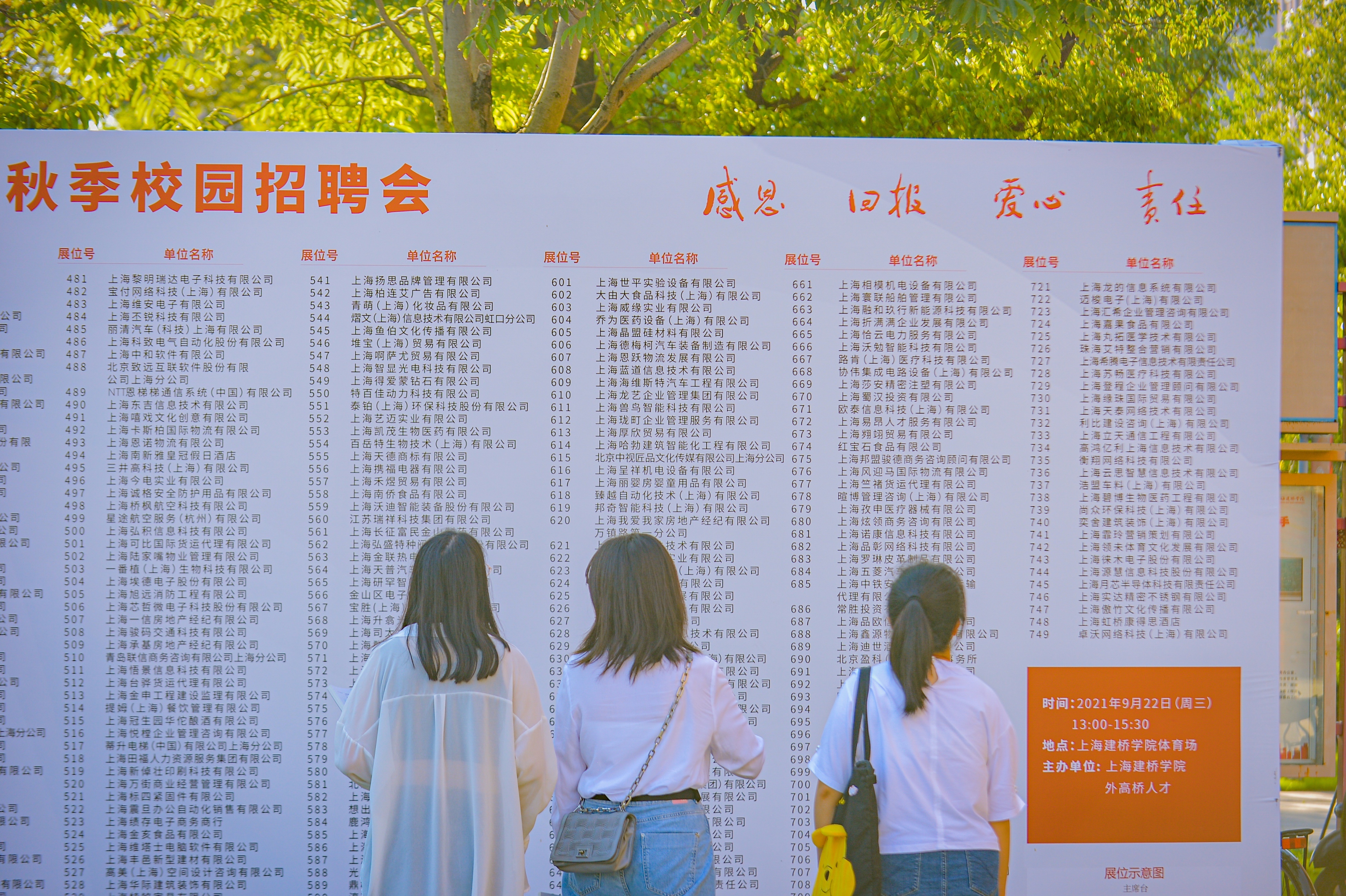 为实现2022届高校毕业生平稳就业的目标,9月22日下午,我校于体育场举办自贸校园行暨上海建桥学院2022届毕业生秋季校园招聘会。共计740余家企业参会,提供招聘岗位近3000个,需求人数逾5000人次,据统计,参会企业收到简历近3000份。本次招聘会为上海市最早举办的秋季招聘会之一。招聘以我校毕业生就业需求为立足点,行业及岗位涉及面广,优质企业众多。共有30家来自外高桥人才的企业、10余家临港企业和百余家重点企业,包括上海燃气浦东销售有限公司、中国银行股份有限公司上海市分行、中国农业银行股份有限公司上海市分行、上海同济建筑室内设计工程有限公司、上海浦东供排水建设工程有限公司等知名企业前来揽才。招聘会还采用“线上+线下”形式同步举行,无法到场的毕业生,可以通过“云就业”平台线上投递简历。招聘会现场气氛热烈,用人单位展位前排满了投递简历和咨询的毕业生。他们积极主动地与用人单位招聘人员交流,介绍自己的专业优势和求职意愿。除了应届毕业生,不少低年级学生也积极前来招聘会现场了解就业行情及企业用人要求,提前做好职场规划。当天,校长朱瑞庭、各二级学院院长及书记也前往招聘会现场,与用人单位及应聘学生