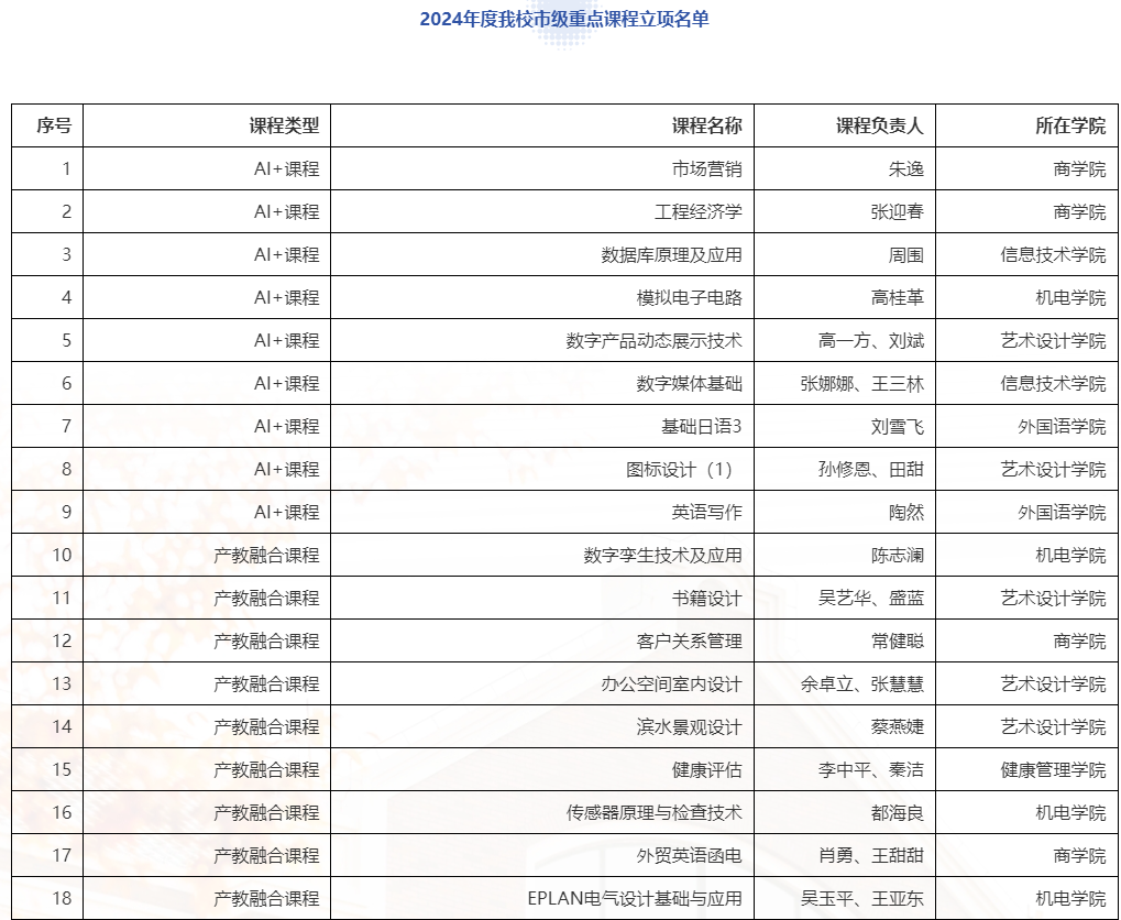 近日,上海市教委发布了《上海市教育委员会关于公布2024年度上海高校市级重点课程立项名单的通知》(沪教委高〔2024〕38号),在此名单中,上海建桥学院表现突出,取得了可喜成绩,展示了其在民办高等教育领域的教学实力与创新潜力。
