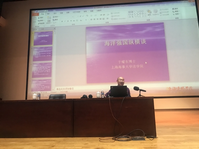 于老师以大量生动的案例和详实的数据为基础,为与会的学们奉献了一场精彩的报告。他首先从“海洋强国战略”的提出背景开始谈起,为同学们详细解读了海洋强国的内涵、当前我国的海洋形势、建设海洋强国面临的挑战等问题。他指出,应对海洋强国建设的挑战需从9个方面入手:第一,强化全民海洋意识,培育海洋人才;第二,制定系统的海洋发展战略;第三,构建完备的海洋法制体系;第四,建立高效的现代海洋管理体制;第五,建设强大的海军和现代化海警;第六,强化海洋科研和装备发展;第七,促进海洋经济发展;第八,强化海洋环境保护;第九,加强国际合作构筑海上丝绸之路。