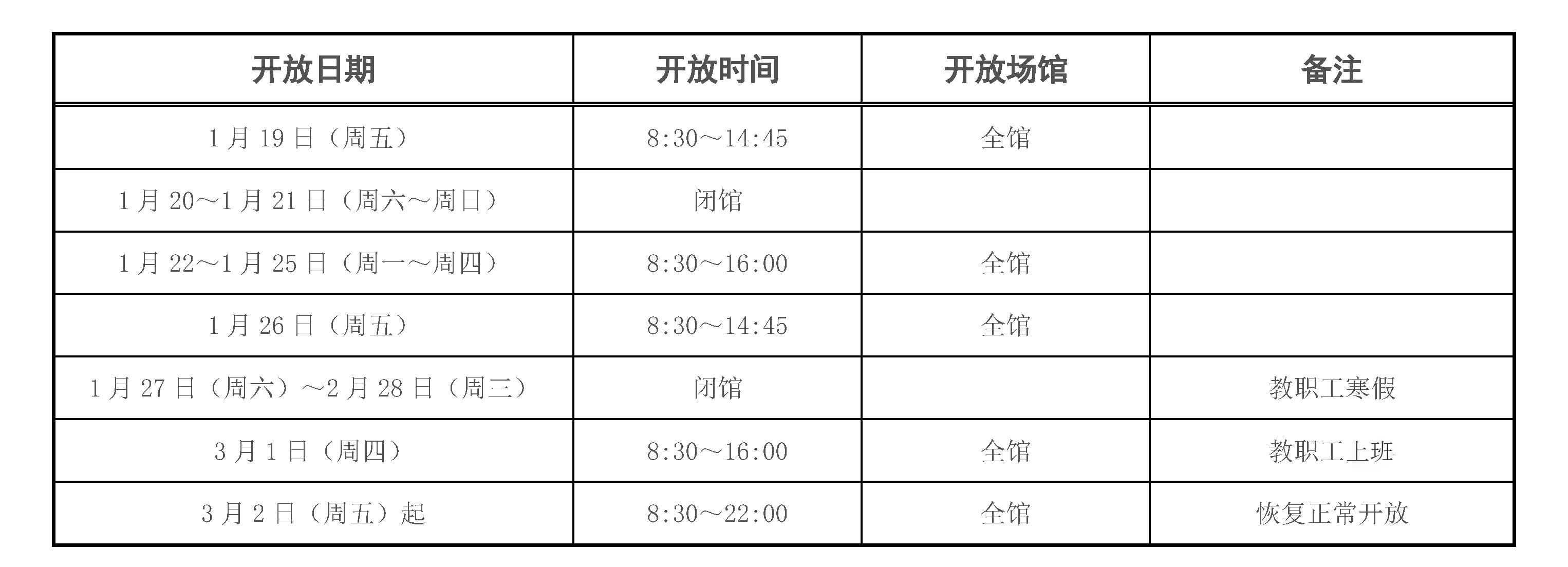 根据学校规定,学生寒假时间为2018年(1月20日-3月2日)。图书馆于1月19日起实行寒假开放时间。具体如下:开放日期开放时间开放场馆备注1月19日(周五)8:30~14:45全馆1月20~1月21日(周六~周日)闭馆1月22~1月25日(周一~周四)8:30~16:00全馆1月26日(周五)8:30~14:45全馆1月27日(周六)~2月28日(周三)闭馆教职工寒假3月1日(周四)8:30~16:00全馆教职工开学3月2日(周五)起8:30~22:00全馆恢复正常开放图书馆底楼的自修室365*24小时开放图书馆2018年1月5日