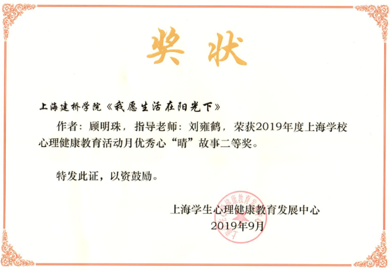 我校申报的《多“彩”心路,“晴”照中华,我与祖国一起成长》荣获2019年度“上海学校心理健康教育活动月”优秀组织奖;《我愿生活在阳光下》获得优秀“心晴”故事二等奖。