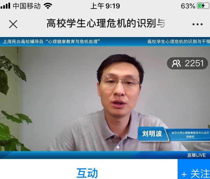 2020年6月5日下午,上海民办高校心理健康教育与危机处理专题培训第四讲在云端进行。第四讲由复旦大学心理咨询中心主任刘明波副教授带来的《高校学生心理危机的识别和干预》。两千多位学员在云端共同学习。