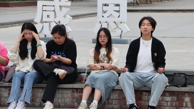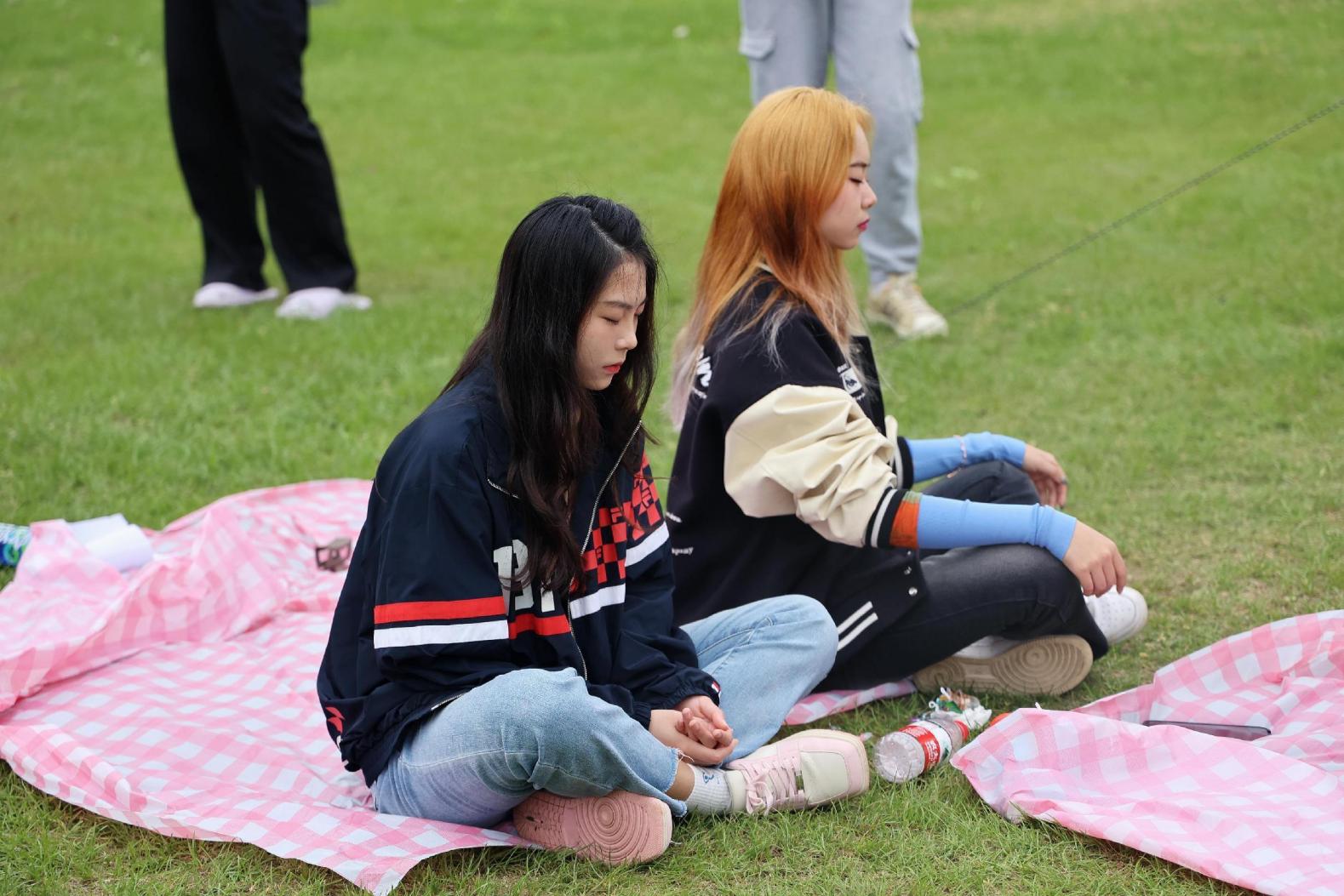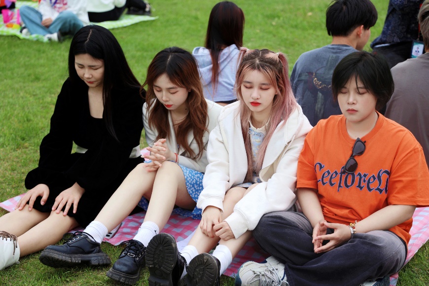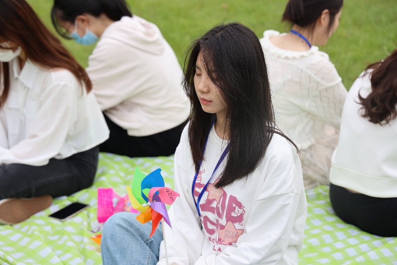 疲惫的生活总要有温柔的梦想,疲惫的身体总要有压力的释放。当我们把自己的身体完全交给阳光和草坪时,世界仿佛安静了。冥想环节由心理协会指导老师马丹妮老师主持,她随着舒缓的音乐引导同学们,大家盘坐在草坪上,轻闭双眸,调整呼吸,将手掌覆于眼睛之上,不约而同安静下来,共同感受着这难能可贵的片刻静谧。