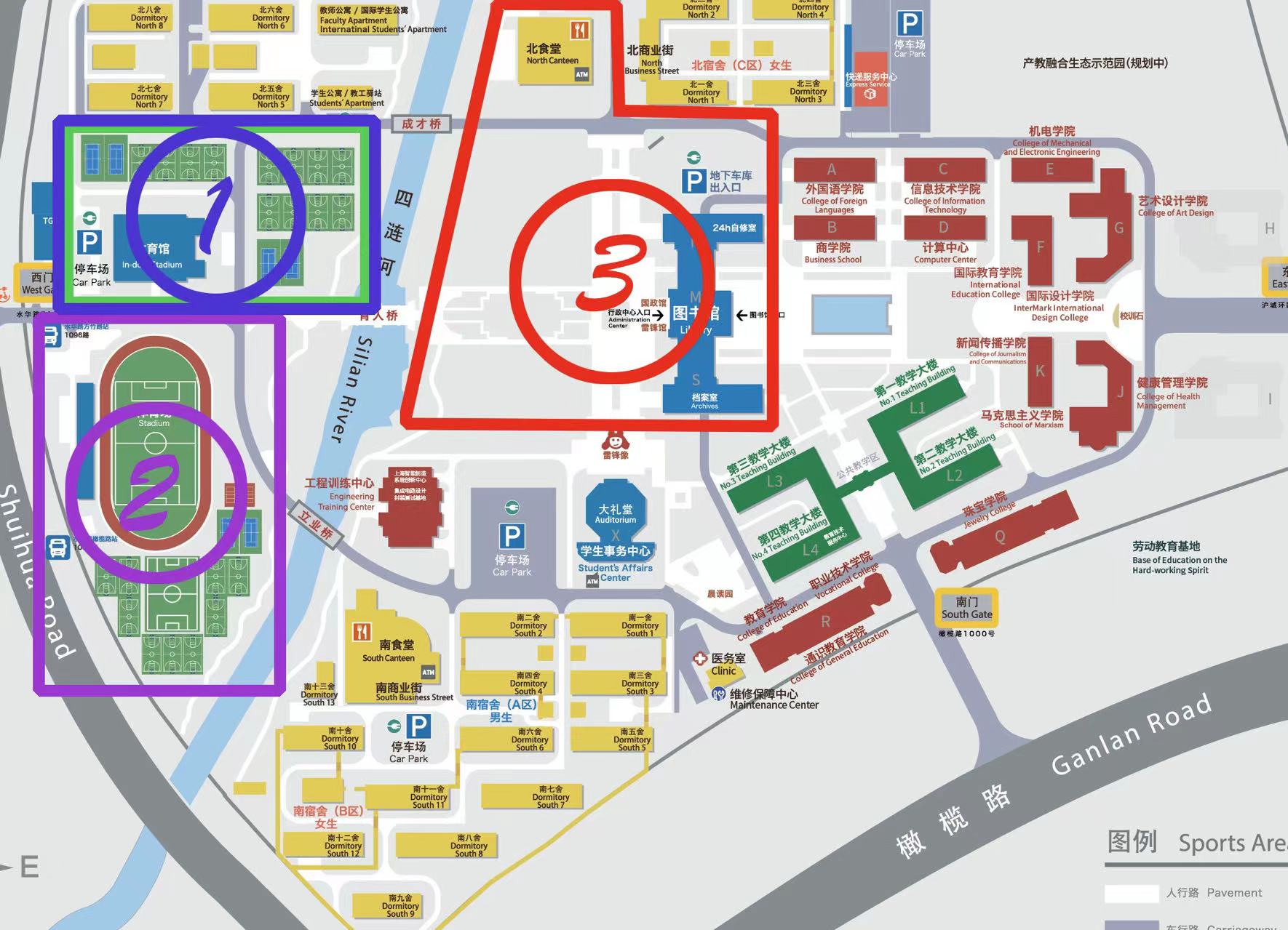 学生组活动的主要场地为1和2,教师组为3。场地划分如下图