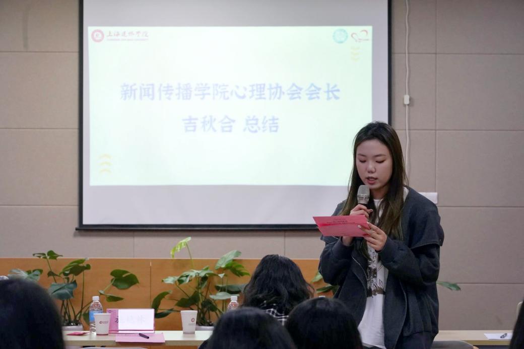 新闻传播学院心理协会会长吉秋合发言。她表示,今天各班心理委员的精彩表现都给她留下了深刻的印象,她也希望本次活动能够为心理委员后续工作的进一步开展打下坚实的基础,从而更好地帮助他们在日后进步和成长。“希望大家能进一步地了解心理健康的内容,增加对心理健康的重视”是她对心理委员们的期待。