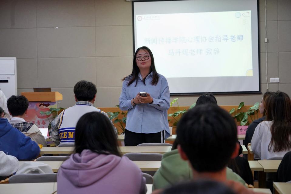 正式比赛前,由新闻传播学院心理协会指导老师马丹妮致辞。首先,她对来到比赛现场的嘉宾、评委以及同学们表示感谢。