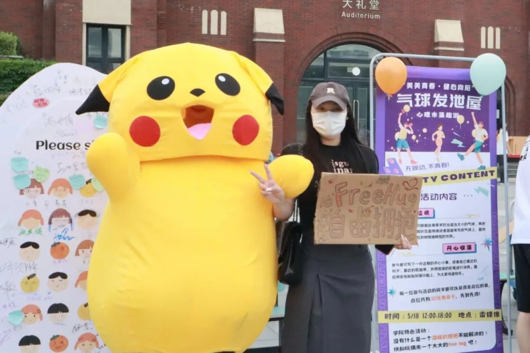 为响应校心协号召,闻传心协在心理市集趣游中组织开展了气球发泄屋活动,同学们将烦恼都吹进气球里,让它们统统都爆炸!发泄负面情绪的同时,写下近期的开心小事,亦或是分享自己喜欢的句子和歌曲等,用彩笔涂鸦展示快乐、放松心情、传递美好。在宣泄完情绪之后就来一个拥抱吧,没有什么事情是一个温暖的拥抱解决不了的。自由拥抱作为闻传心协的特色活动,帮助同学们卸除烦恼,拥抱浪漫。