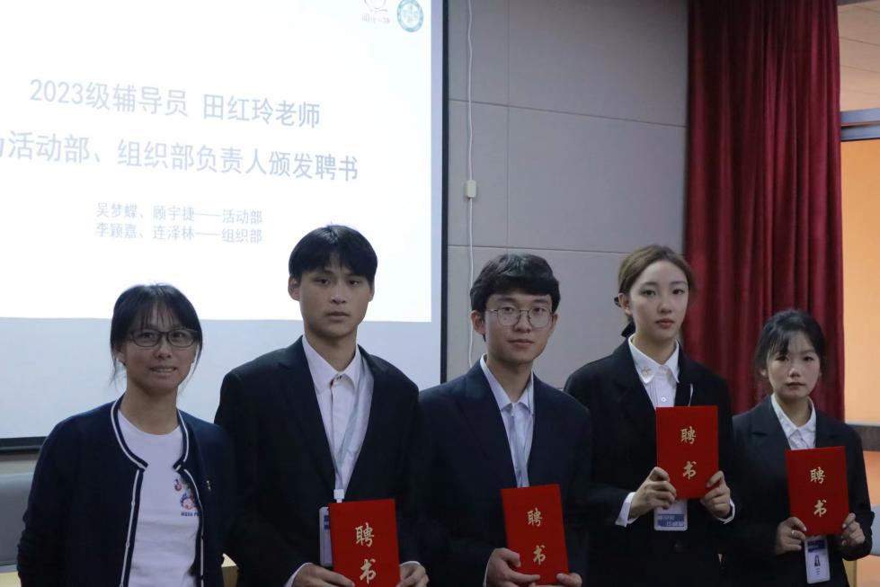 马丹妮老师、田红玲老师分别为会长团和各部门负责人颁发聘书。随后,由钱孝铭老师、曹汝朵老师为各位新干事授牌,也代表着各位新干事正式加入闻传心协的大家庭。