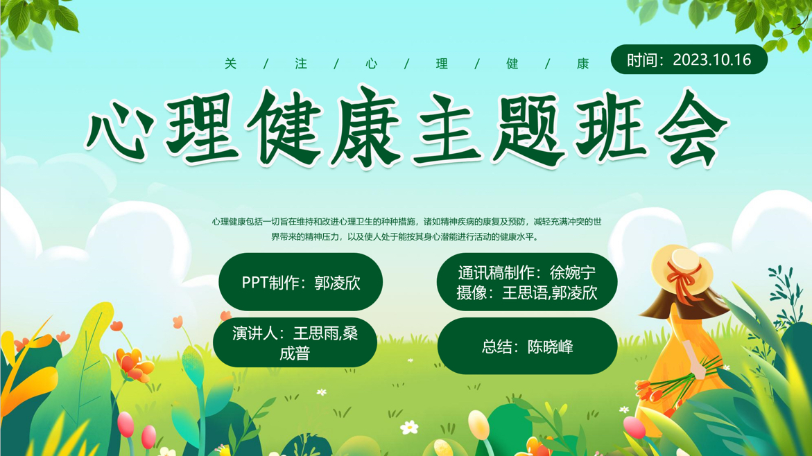 本次班会由郭凌欣制作PPT,徐宁婉撰写通讯稿,陈晓峰总结,桑成普、王思雨主持召开。班会主要分为心理健康的含义,影响心理健康的因素,亚心理健康,心理健康小测试和保持心理健康的途径五部分。