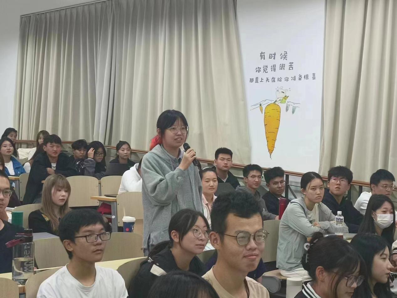 然后,史佳佳为同学们讲解了“摆脱不良情绪”的内容。她详细地为大家讲解了压力的定义与来源,并提出了缓解压力的四个有效方法:适当运动、冥想、向他人倾诉以及心理咨询。她指出,当遇到自己无法解决的问题时,及时向他人求助是最直接有效的办法。