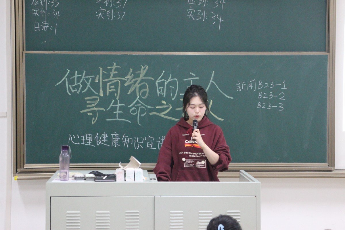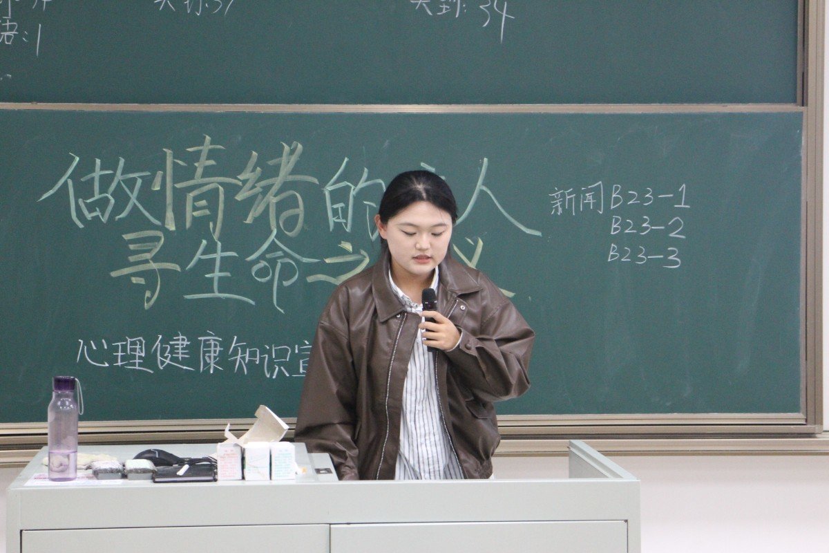为促进我校朋辈心理互助体系的建设,帮助同学们在不断提高知识素养的基础上,克服不良情绪的困扰,培养自信乐观、豁达开朗的健康心理,10月18日晚,新闻B23-1、B23-2、B23-3班于二教406顺利开展本学期第一次心理健康主题班会。此次班会主题为“做情绪的主人,寻生命之意义”,意在告诉同学们情绪管理对生活以及人生的重要性,引导同学们活出属于自己的精彩人生。