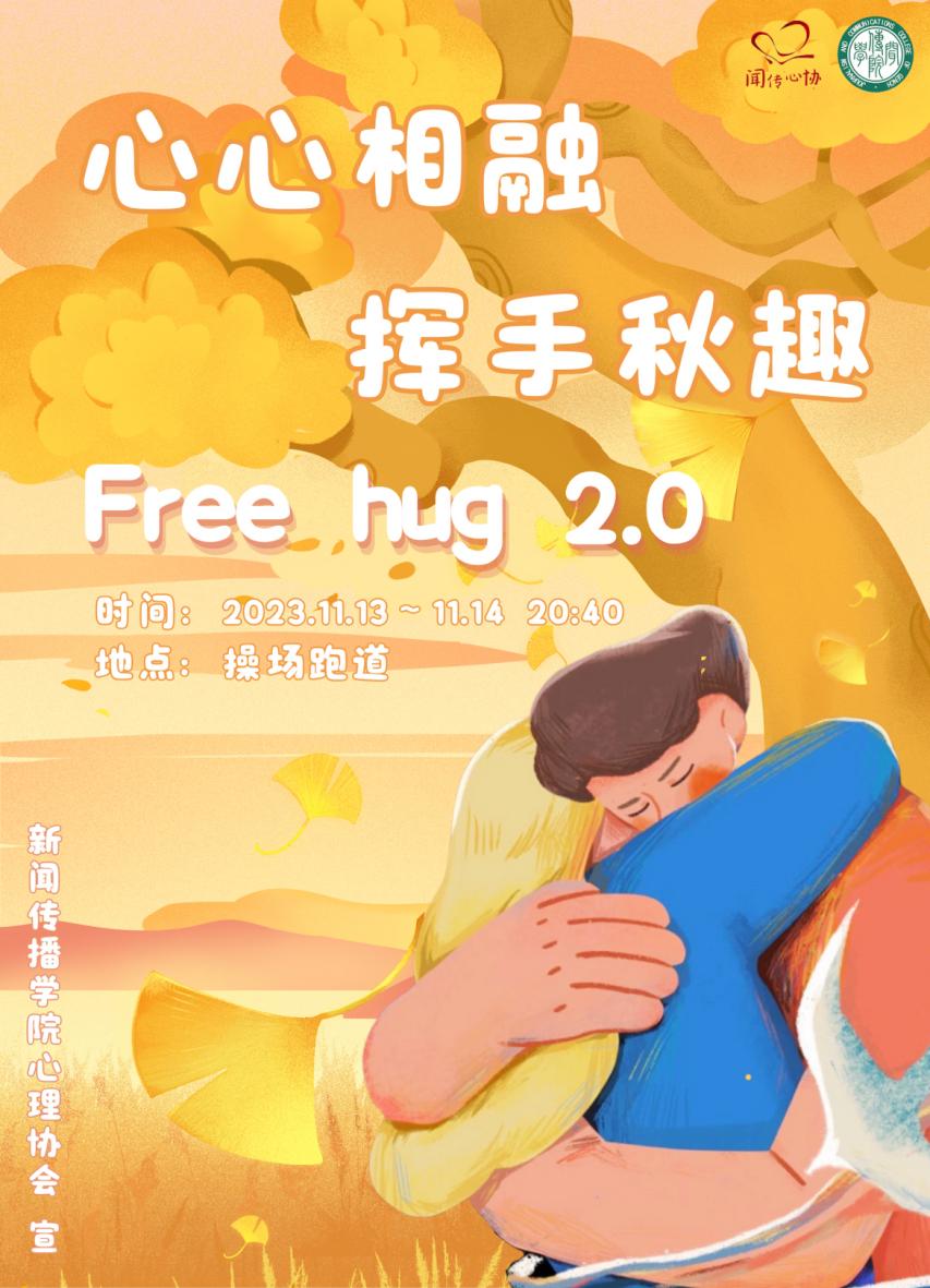 为保障学生的身心健康,促进情感联结,帮助同学克服自己的社交障碍,缓解社恐情绪,营造团结友爱、健康温暖的校园氛围,特此举办“心心相融·挥手秋趣”free hug2.0,希望借助本次活动,让大家一起感受拥抱的力量,传递温暖,一个小小的拥抱和祝福也许能让大家收获一天的开心。