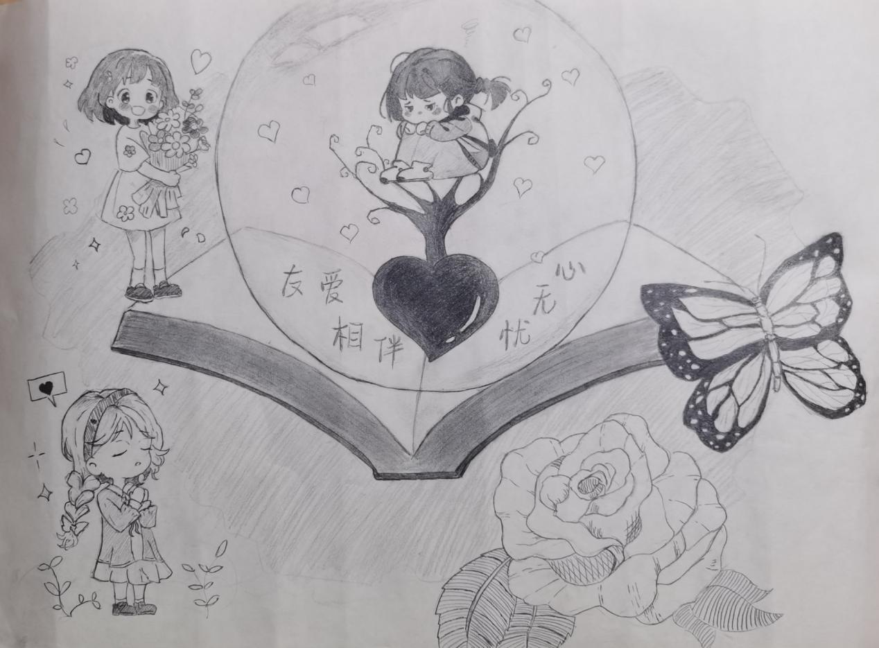 《情友栖心》是一幅富有情感和温暖的绘画作品。画面中,一个难过的小女孩坐在一颗爱心树上,周围是她的好朋友们在鼓励和支持着她。她们聚集在一颗水晶球和一本书的周围,象征着智慧和内在的宝藏。一朵鲜艳的花盛开在树旁,象征着希望和生机。整幅画传递出友爱互助和心灵抚慰的信息。在困境中,友情的力量和情感的支持温暖了她的心灵,帮助她战胜困难,重新找到快乐和勇气。这幅作品鼓励我们相互扶持、共同成长,共同创造一个充满爱和关怀的世界。