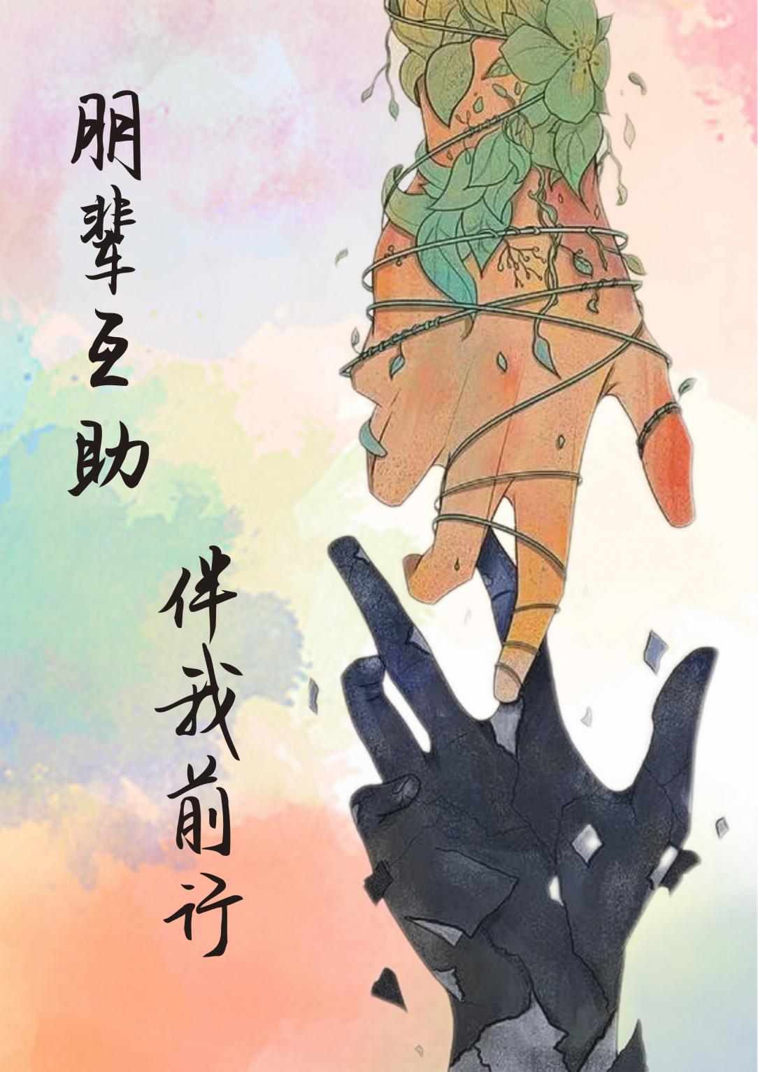 作品探讨了抑郁与希望这一主题。画面上的两只手分别表达着“希望”与“抑郁”。以艺术的形式表达了我们通过同辈的力量,最终找到了生命中的光芒。画面中表达“抑郁”的手,在触碰到同伴的时候,由黑色逐渐转变为蓝色,表达了在同伴的陪伴下,共同走过阴霾,坚定地追求希望。作品整体传达朋辈心理互助的力量,以及同心同伴同在的关键价值。