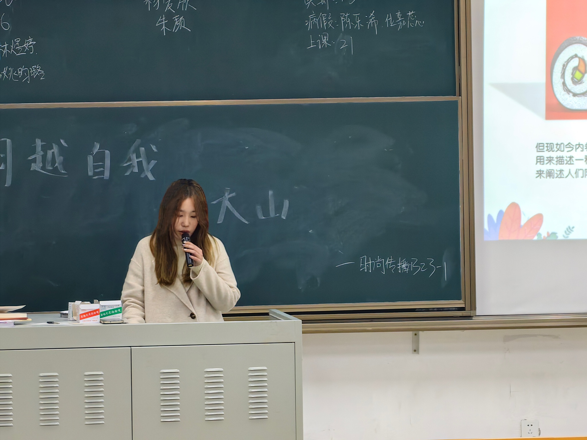 首先由心理委员王雯雯向同学们介绍本次班会的主题,本次班会主要分为四个部分。首先她介绍了当代社会的现状,内卷的时代让年轻人产生出迷茫、无助、沮丧等情绪,使他们的心态飘忽不定,由此产生出摆烂的心理。同时她还阐明了社会现状对人们心理上的影响,并介绍了同学们所面临的生活压力。她归纳出了六种不同的压力,包括学业压力、社交压力、经济压力、未来职业规划、社会压力以及健康问题的压力。她表示这些压力会影响同学们的心理健康。