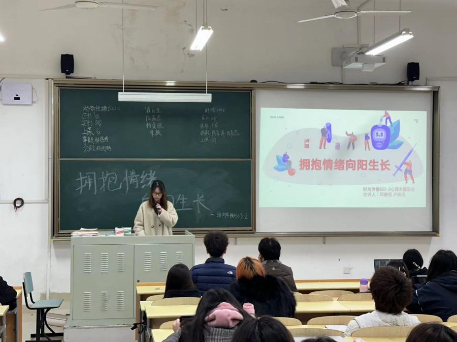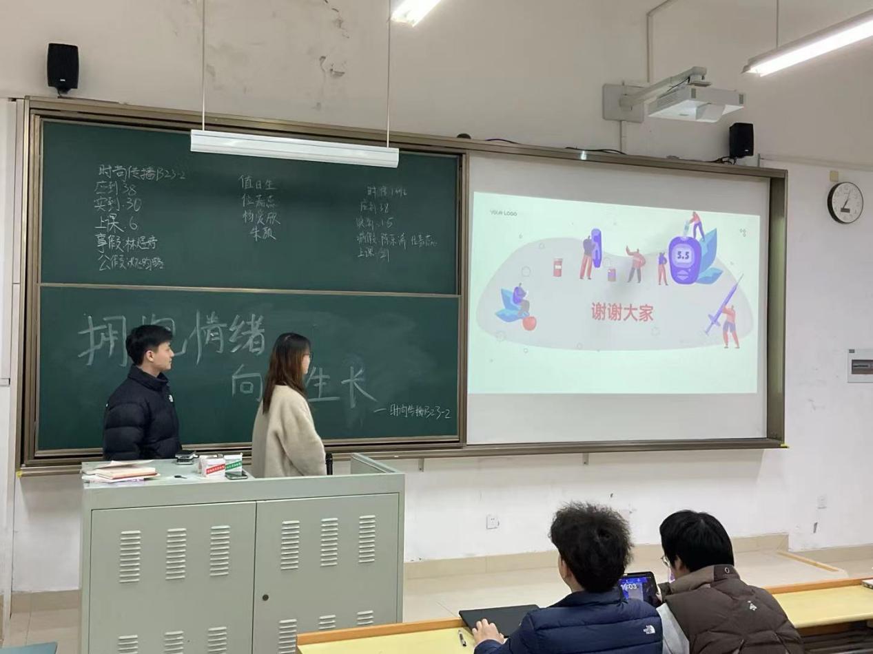 为了帮助同学们认识到自身的优势和潜能,鼓励他们面对困难时保持乐观心态,学会自我调节和情绪管理,拥有积极向上的生活态度,为自己树立明确的目标并努力实现,时尚传播B23-2心理委员邓璐倪与卢双伍在二教402开展了《拥抱情绪,向阳生长》的主题班会。