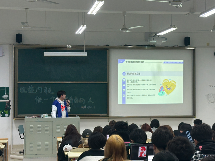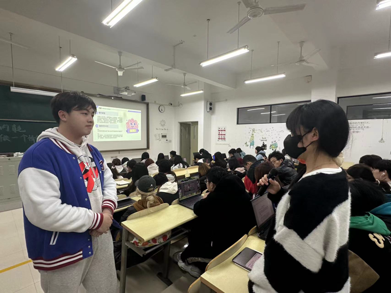 紧接着,罗晟宸发起小游戏“抽卡”活动。同时,来自新媒体B23-1班彭建乔同学和沈奕维同学对大学生心理相关案例发表了自己的观点,并分享了自己的经历和解决方法,进一步丰富了同学们对情绪管理的认识。