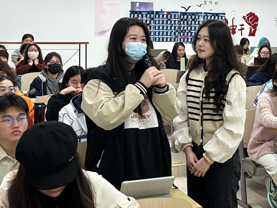接着应佳熙抛出了一个问题“你认为什么样的人更容易出现心理内耗?”。这个问题由新闻学B23-2班李怡婕同学回答,李怡婕认为:“敏感内向的人可能更容易出现情绪内耗的行为。”