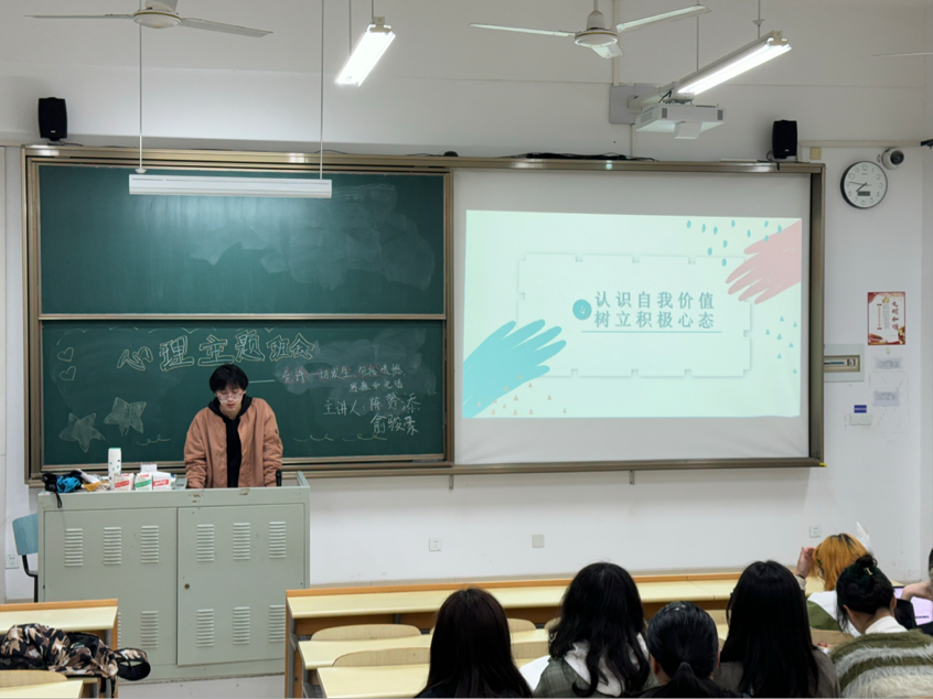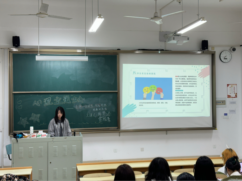 班会伊始,心理委员陈赟添通过生动的案例,向同学们介绍了大学生常见的心理困扰,如焦虑、抑郁、适应障碍等。她指出,这些困扰往往源于压力、环境变化以及不正确的自我认知。她鼓励大家正视这些困扰,勇敢面对并寻求帮助。