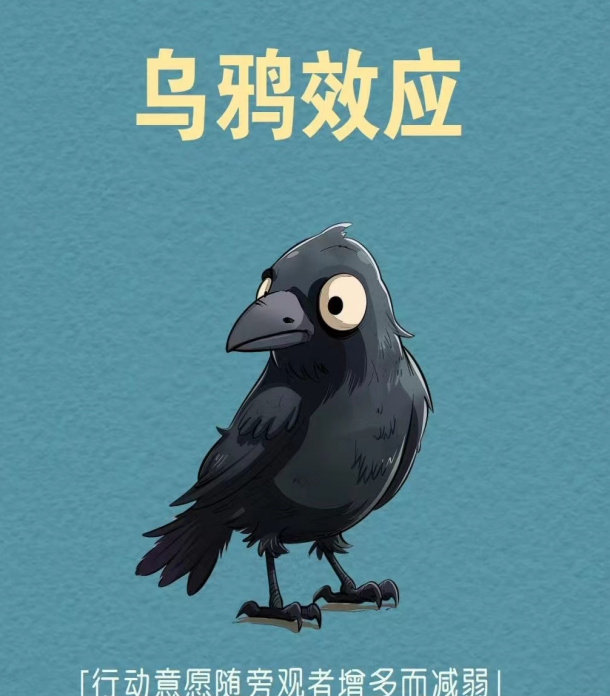 “乌鸦效应”,也称作“旁观者效应”。当人们处于群体中时,个人感受到的责任感会被稀释,他们可能会认为有其他人会采取行动。此外,人们也会在无形中互相观察,试图从他人的行为中寻找如何应对的线索,这种互相观望导致了行动的迟缓。