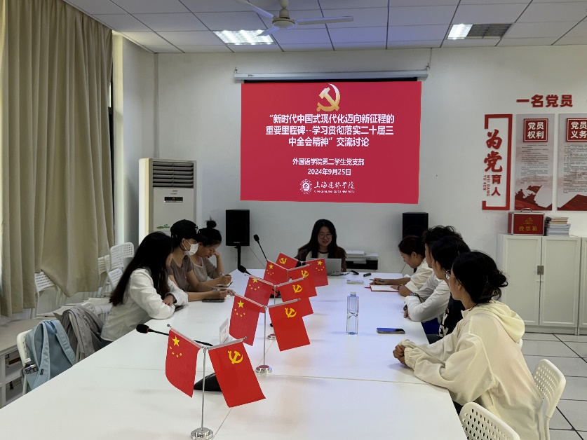 为学习贯彻落实二十届三中全会相关精神和学校第四次党代会精神,外国语学院第二学生党支部2024年9月25日于外国语学院309会议室召开学习交流会。会议由外国语学院第二学生党支部书记方毓锦主持,支部全体师生党员参与本次会议。会议伊始,支部书记方毓锦带领支部全体师生党员集中学习学校第四次党代会精神。她指出,第三次党代会以来,学校党建引领、校园文化、教育改革教育质量、师资队伍、学校治理和学校纪律建设等多个方面取得显著成效。未来五年,是学校决胜“十四五”、谋划推进“十五五”的历史交汇期,是学校提升办学水平和办学层次,实现全面建成特色鲜明的应用型一流民办大学的关键时期。学校将坚持一流党建引领,以立德树人根本任务,全面深化综合改革,完善人才战略布局,广泛凝聚共识合力,完成校园更高质量的发展。方书记强调,新的起点上,全体师生党员都应提高政治站位,深刻领会党代会精神,用智慧与勇气促进引领学校开创更加光明的未来,在新时代新征程上奋力谱写建设特色鲜明的应用型一流民办大学的崭新篇章。随后,支部书记方毓锦带领师生党员学习了《中国共产党第二十届中央委员会第三次全体会议公报》和《中共中央关于进一步全面深化改革、推进