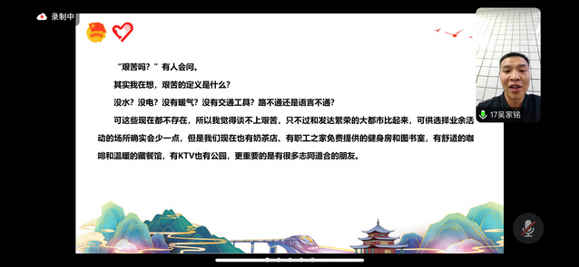 1111MicrosoftInternetExplorer402DocumentNotSpecified7.8 磅Normal0 为积极响应大学生志愿服务西部计划,鼓励大学生到西部基层开展为期1-3年的教育、卫生、农技、扶贫等志愿服务,商学院面向全院应届毕业生开展西部计划志愿者分享会等系列活动。 2024年4月11日,“西部计划奔赴西部热土,启航志愿青春”的分享会在线上举行。此次分享会邀请了2017年服务西藏的吴家鸣学长和2020年西部计划志愿者章崎琳学姐。此次参会的还有商学院校友会秘书长叶媛媛、商学院校友会秘书长潘兰兰、商学院毕业班全体辅导员和各位毕业班学生。分享会上,吴家鸣和章崎琳讲述了自己在西藏和贵州的经历,同时在线为学弟学妹们答疑解惑。 会议伊始,吴家鸣详细讲述了自己从2017年8月开始服务至今的经历,包括当地的现状,打破了学弟学妹对西部恶劣环境的刻板印象。同时也分享很多在西藏服务的趣事。随后,章崎琳激动的讲述了因为学校跟吴家鸣学长的缘分,当年在学校听吴家鸣的分享会以及给学长寄月饼和明信片。时隔多年,她自己也收到了在校的学弟学妹寄给她的月饼和明信片。同时今天也在给学弟学妹做分