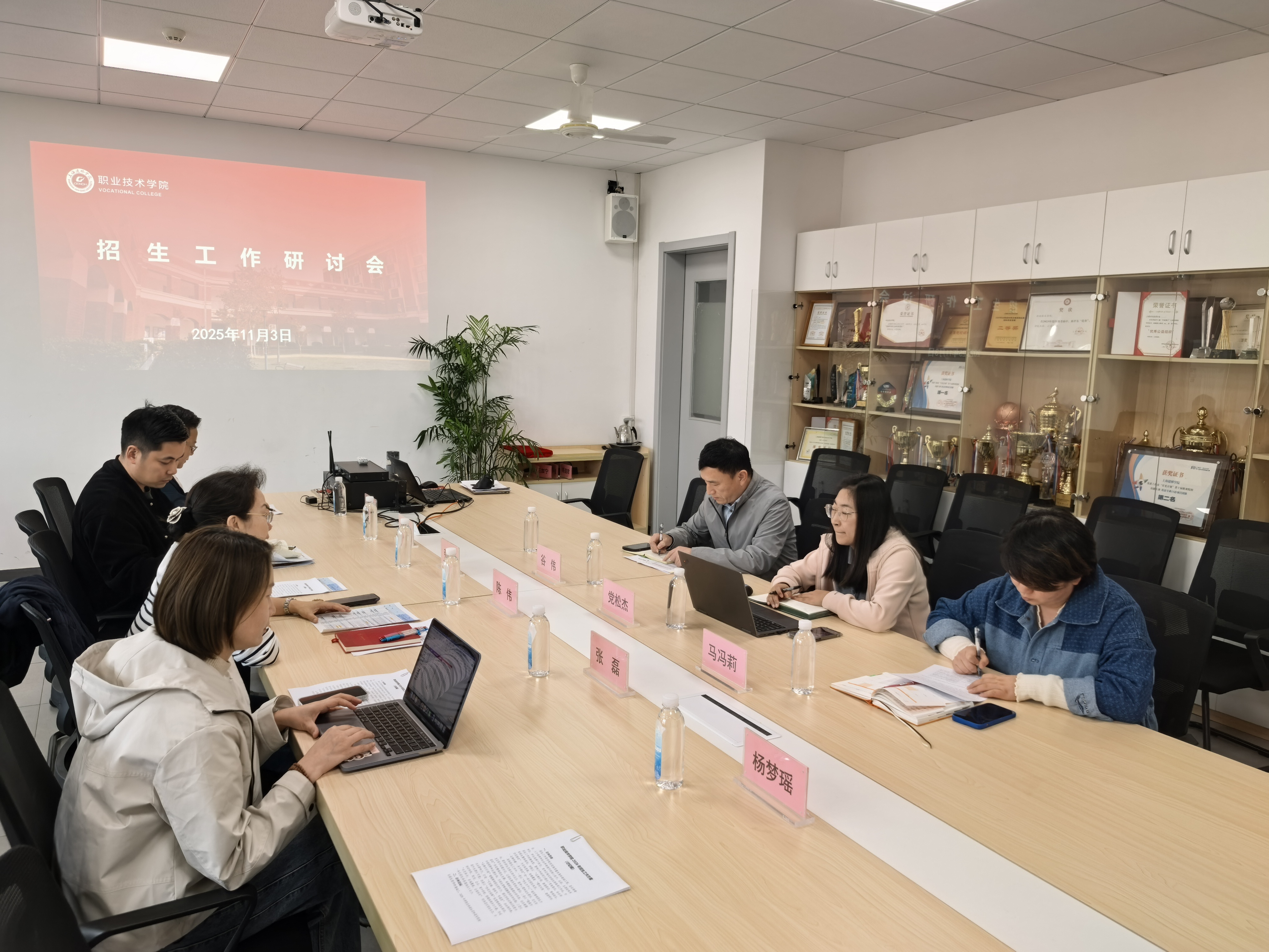 为应对招生竞争新形势,明确下一阶段工作方向,11月3日,职业技术学院招生工作研讨会。副校长陈伟、校长助理张巍、招生办公室主任张磊、副主任钟子健等5人出席会议。职业技术学院院长谷伟、党委书记党松杰、副书记马冯莉参加会议。会议围绕学院招生方案优化、专业特色打造、宣传策略升级和目标考核等议题展开研讨,谋划招生总体工作。谷伟院长首先就学院招生方案进行了详细阐述,表示学院将以“品牌引领、数据驱动、精准招生、协同推进” 为思路,构建 “需求对接——数据研判——品牌传播——多方联动”的一体化招生体系,旨在实现招生数量与质量双提升。陈伟副校长对学院的方案予以肯定,表示学院应树立“招生—培养—就业”一体化理念,主动开拓市场。同时要明确招生时间规划与核心举措、筛选生源数据,后续按节奏分阶段落实任务。要强化数据驱动,精准定位生源群体,结合区域需求优化专业布局,提升招生宣传的针对性与有效性。聚焦“升学+就业”双路径,突出升学目标,拓展涉外合作项目,为学生提供多元升学通道,点亮品牌专业,以专业亮点提升学院吸引力。张磊主任介绍了学院今年的招生情况和明年招生目标。陈校长强调,要建立动态反馈机制,定期评估招生进展并及