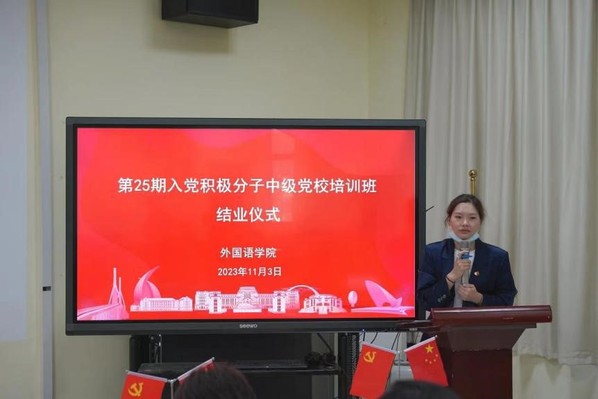 2023年11月3日,外国语学院第25期入党积极分子中级党校培训班结业仪式于外国语学院129顺利开展。出席本次活动的有外国语学院党委副书记伊莉、第一学生党支部书记赵磊、第二学生党支部书记尹洁、培养联系人孟娣以及外国语学院第25期入党积极分子中级党校培训班全体学员。本次活动由外国语学院党委组织委员刘沛雨主持。 外国语学院党委副书记伊莉发表致辞,时代的责任赋予青年,时代的荣光属于青年,各位入党积极分子要坚定理想信念,端正入党动机,深入学习理论知识,充分发挥先锋模范作用,在新时代征程中无畏前进,啃下硬骨头,应对新挑战,并在实践中检验初心和动机,共同为共产主义事业奋斗、为中国人民的幸福奋斗。 自开班至今,中党学员们一共完成了五讲党课学习并参与了两场实践活动——“清篮行动”及“感受时代新发展,我看城市新变化”外语视频制作,落实理论与实践相结合,感悟与行动相统一。学员们积极响应,做到不落队,勤学习,争先锋,营造了一个严肃认真、风清气正的良好学习氛围。 学院党委为赵逸凡、吕婕颁发了中党优秀学员,为韩雪、郑艳颁发了中党优秀党务工作者。赵逸凡表示,中党培训课程让学员们深刻领悟了党的政治理论方针,党课虽