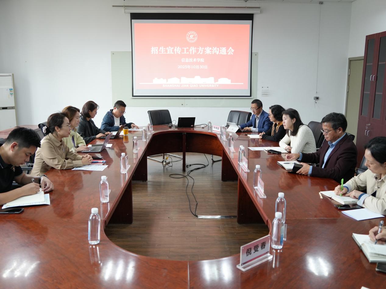 2025年10月30日,信息技术学院在205会议室召开招生宣传工作方案沟通会,副校长陈伟、招生办公室主任张磊、副主任钟子健以及颜世浩、王丹老师出席,信息技术学院党政领导参加会议。会议由陈明教授主持。陈明教授热烈欢迎陈伟副校长一行莅临学院指导招生工作,并从学院的发展规划、学科建设、专业布局调整、人才培养体系建设以及国际交流拓展等方面介绍了学院的现状及未来发展方向。学院党委书记杜鹃从建强专业内核:筑牢招生“核心竞争力”;创新宣传矩阵:打造招生“传播感染力”;完善组织保障:明确招生“闭环责任”;精准生源对接:织密招生“精准网络”;细化实施步骤:保障招生“有序推进”;拓展多元赛道:拓宽招生“增量空间”等维度详细介绍了学院招生工作方案。招生办公室张磊主任介绍了学院今年的招生情况和明年招生目标。钟子健副主任介绍了近期招生办公室的主要工作安排。会上,与会人员围绕如何有效开展招生工作进行深入的交流与讨论。会议最后由陈伟副校长作重要讲话,她对信息技术学院的招生工作方案给与充分肯定,表示学校将全力支持学院做好招生工作;强调大家既有知识逻辑和学科逻辑,也要有市场意识,通过问卷的形式对专业志愿进行排摸,确保专