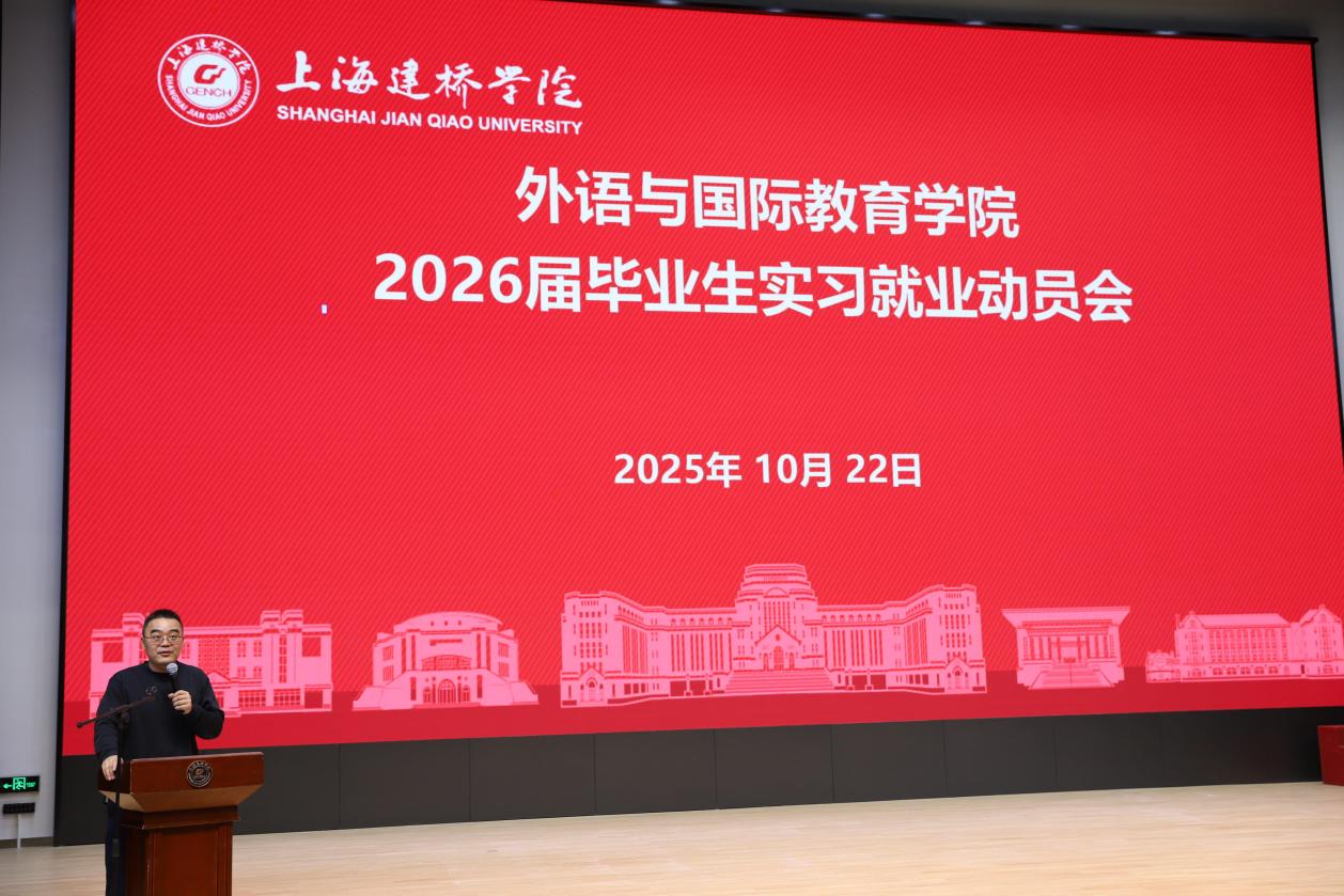 为进一步引导和帮助2026届毕业生明确目标、认清形势、树立信心,顺利做好毕业前的各项准备。10月22日,外语与国际教育学院于大礼堂组织召开2026届毕业生实习就业动员大会。学院领导、党团负责老师、毕业班辅导员以及全体2026届毕业生参加会议。大会分两场召开,会议由党委副书记徐伟主持。动员大会在庄重而热烈的氛围中开始。首先,王海燕副院长就毕业实习与毕业论文两大关键教学环节进行详细讲解。着重强调了毕业实习和毕业论文在本科培养方案中的重要地位,是检验学生学习成果、提升实践能力与创新能力的综合平台。对实习任务、时间安排、过程管理、成果要求以及毕业论文的选题、撰写规范、答辩流程等提出了明确而具体的要求,希望同学们以严肃认真的态度和高度的责任感完成好这两项任务,为自己的大学生涯交上一份满意的答卷。随后,徐伟副书记围绕学生工作与就业动员发表讲话。首先从情感育人角度出发,介绍了学院当前正在开展的两项特色活动——“实习就业优秀大学生”评选与“感恩家人模范大学生”评选,鼓励同学们积极展现自我、感恩亲情。“今天的同学,一辈子的朋友”,希望大家在离校前的宝贵时光里,倍加珍惜同窗情谊,在就业与升学的道路上彼此支