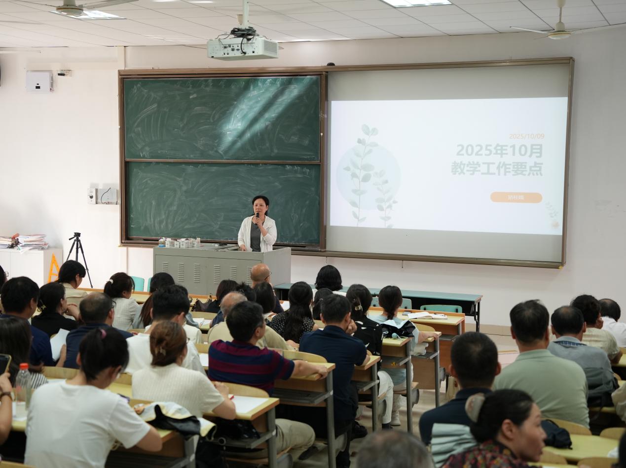 2025年10月09日,信息技术学院在三教120召开全体教职工大会暨第四届师德师风建设月启动会。学院党政领导、全体教师参加,会议由学院办公室主任蒋玮荻主持。会议伊始,学院为刘艳艳、崔斌、王平、柯洺达、朱亮、张雨晨、王圣洁、谭敬敬、胡晓媚等八位新进教师举行热烈的欢迎仪式。新进教师结合各自的成长轨迹、岗位职责逐一进行自我介绍。在温馨愉悦的氛围中,老师们加深了彼此的了解,增进了同事的情谊。矫桂娥副院长围绕教学工作总体情况、期中教学检查、上海市高等学校信息技术水平考试、毕业设计工作等四个方面对10月份教学工作重点进行安排。强调新进教师要做好听课任务,熟悉教学流程和方法,快速提升教学能力,确保教学质量;鼓励教师积极投入到教学改革中,不断尝试新的教学方法和手段,善于借用大模型和学习平台的功能开展教学工作,有效提升教学质量。学院党委副书记徐娜作第四届师德师风建设月活动启动动员。她从活动目标、活动时间、活动主题、活动安排等四个维度详细介绍了第四届师德师风建设月的总体安排;强调学院要深刻把握“立德树人”这一教育根本任务,以“思想引领” 为先导、以“制度保障”为根基、以“文化实践”为目标,将师德师风建设作