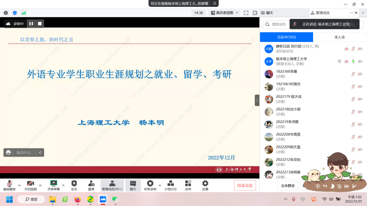 2022年12月1日(周四)下午13:00-14:30,外国语学院日语系有幸邀请到上海理工大学外语学院MTI教育中心副主任、上海理工大学青年五四奖章获得者、第三届第四届“儒易杯”中华文化国际翻译大赛评审专家、教育部学位中心论文评审专家杨本明副教授,为我校外国语学院日语系19级、20级、21级约210名同学进行了题为“外语专业学生职业生涯规划之就业、留学、考研”的学术讲座。本次讲座由外国语学院与科研处共同举办,由日语系主任刘尔瑟老师主持。日语系张雪娜副教授、刘雪飞副教授及其他青年教师一同参加了本次讲座。杨本明副教授首先介绍了我国近二十年的出生人口与高考录取人数、近年全国的研究生报考人数与录取人数以及上海地区的研究生报考人数和录取比率,并且系统地介绍了日语专业的学术硕士和专业硕士的备考方法、复习要点以及注意事项。杨教授还利用微信群,慷慨地与同学们分享他了多年积累的各类日语专业考研复习资料,同学们反响热烈。杨教授表示,在一些国家级、省部级的日语学科竞赛中也会看到上海建桥学院日语系学生的身影,说明建桥日语专业的同学综合能力还是比较强的,完全可以通过本科期间两三年的努力,跳起来去试着报考一些98
