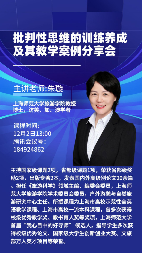 Normal0false7.8 磅02falsefalsefalseEN-USZH-CNX-NONE为深入贯彻新时代党的教育方针,不断提升学院教师的育人能力和业务水平。12月2日下午,商学院有幸邀请到上海师范大学朱璇教授为大家做题为“批判性思维的训练养成与教学案例”的主题讲座。朱璇教授结合自身的教学实践,指出批判性思维是每个人自我更新、不断提升的动力;同时认为作为一名老师,批判性思维是鉴别选择教学资料的需要,是读好书、讲好课、做好研究的需要;并从“课前,课中,课后,反馈”四个环节提出批判性思维的训练方法。会上,商学院尚斌、张学超、石启辉,罗燕辉等多位老师与朱璇教授进行了互动交流,并认为在教学理念和教学方法上受到很多有益的启发。