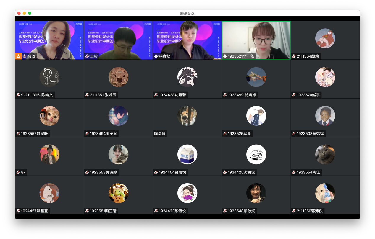 本周教学已进入到第11周,为保障2019级毕业设计工作有效开展,加强过程管理,保证毕业设计质量,艺术设计学院视觉传达设计系利用11月30日~12月2日三天的时间完成了毕业设计的中期检查工作。受疫情防控与学生实习因素的影响,本次检查以全员线上答辩的形式展开。本次参加中期答辩的学生共282人,分为11个答辩小组,每组3位评审老师。院领导与学院督导高度重视此次中期检查工作,并进入答辩会议室了解掌握现场情况。答辩过程中,每位学生介绍自己的课题、汇报作品的进展与导师的指导情况。答辩组评审老师检查毕业设计相关材料,根据学生的作品完成情况进行提问并给出优化建议。本次中期检查工作组织有力,程序规范,平台运行平稳,学生陈述和答辩组评审提问交流环节顺畅,毕业设计作品总体进展良好,基本达到中期检查要求。通过本次检查,督促了学生毕业设计的进程,也促进了毕业设计质量的提升。