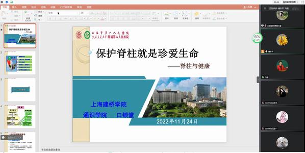 疫情期间,做好全校师生的健康服务工作尤为重要,11月24日,教育(通识教育)学院邀请了上海市第六人民医院针推伤科副主任,临港院区针推伤科主任口锁堂博士,以《保护脊柱就是珍爱生命——脊柱与健康》为题,针对常见脊柱问题,进行了深入浅出、声情并茂的阐述和讲解,既有深厚的理论高度,又有高效实用的指导性。虽然是线上讲座,全校师生反应依然非常热烈,腾讯会议刚一开放,300个进群名额瞬间被热情的师生们一抢而空,有很多师生因为没有能够及时进入腾讯会议聆听此次讲座倍感遗憾。口锁堂主任的精彩讲座得到了广大师生的一致好评,尤其是关于日常玩手机对脊柱产生影响部分的内容,更是引起了很多学生的共鸣。听完讲座,大家纷纷表示,此次讲座对自己增强健康意识有警醒作用,今后在生活中一定要自觉养成保护自己脊柱的习惯,以更加健康的体魄、充沛的精力更好的工作和学习。