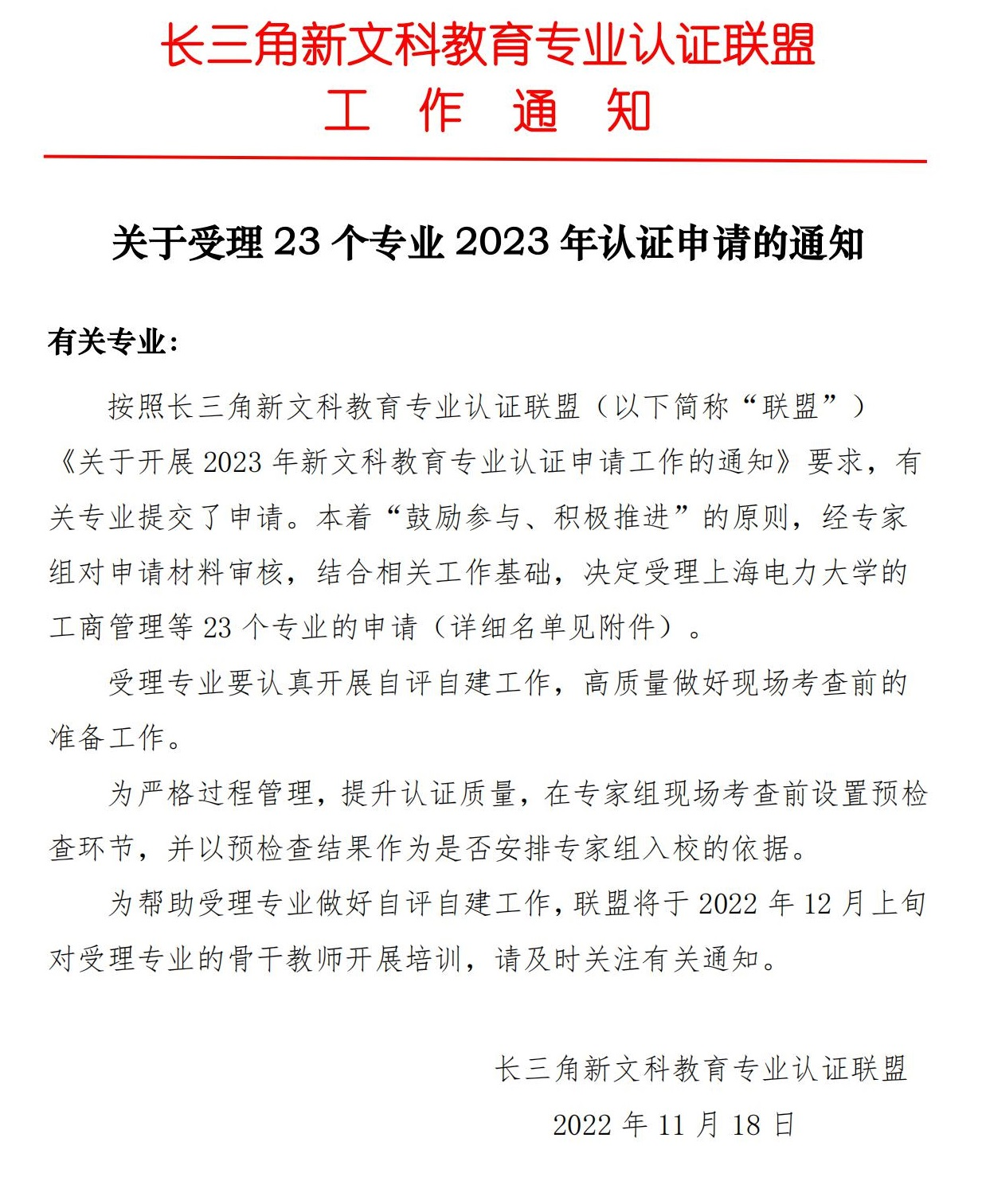 近日,长三角新文科教育专业认证联盟公布了《关于受理23个专业2023年认证申请的通知》,我校外国语学院日语专业获批受理2023年新文科教育专业认证申请。参与专业认证是推进教育教育改革、提高人才培养质量的重要举措,也是一流本科专业建设“双万计划”的重要指标。近年来,学校高度重视各类专业认证工作,以上海市一流本科专业建设为契机,不断加强顶层设计,加大投入保障,强化人才培养标准意识,切实将“学生中心、产出导向、持续改进”等理念落实到人才培养体系中。接下来,外国语学院将以参与认证工作为契机,指导日语专业按照专业认证分委员会的要求,推进各部门认真开展自评自建工作,高质量做好现场考查前的各项准备。