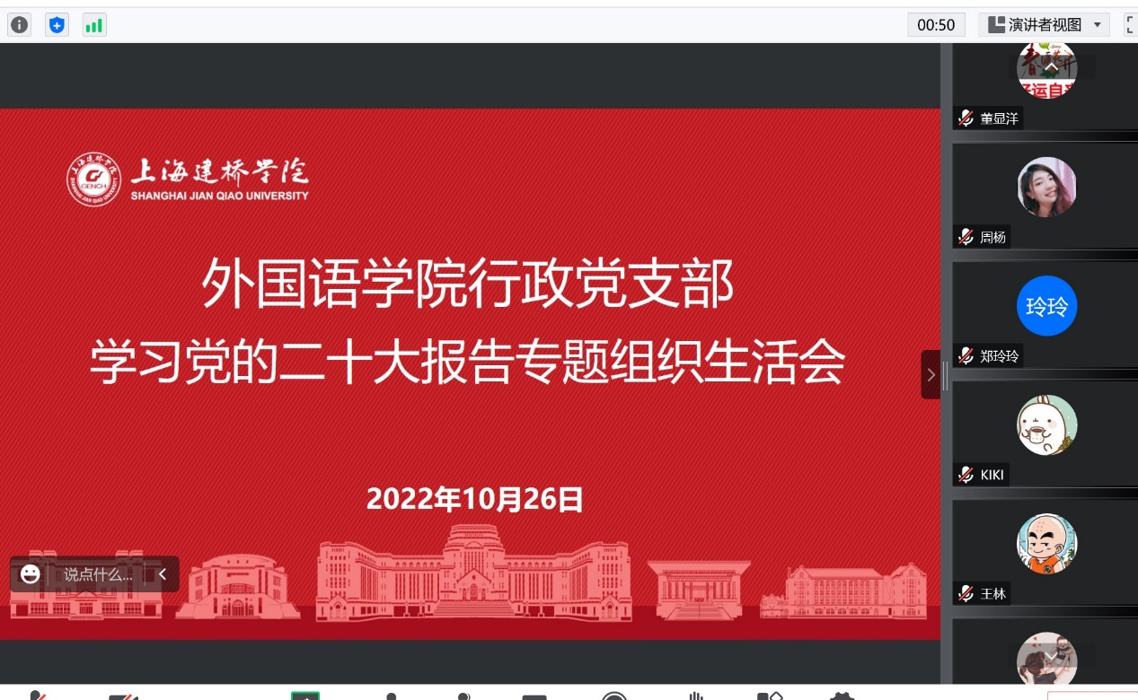 2022年10月26日晚上7点,外国语学院行政党支部召开线上组织生活会,学习党的二十大报告以及《习近平谈治国理政第四卷》。全体党员参加会议,会议由党支部书记陆璐主持。首先,会上支部书记陆璐带领全体党员学习了党的二十大报告,从“三件大事”到“六个必须坚持”,“中国式现代化”以及实施科教兴国战略等进行了系统的学习,随后,支部党员结合自身的本职工作进行了交流发言。党员教师周杨表示:作为一名高校教师,我们是新时代建设主力军的引路人,我们传播知识,同时我们也不应忘记“灵魂工程师”这一伟大使命,帮助学生树立正确价值观。作为一名党员,应该自觉做到艰苦奋斗的作风不变,吃苦耐劳的精神不变,甘于奉献的传统不变,始终保持共产党人的本色。所有这一切就要求我们必须立足岗位、踏实工作、爱岗敬业,把做好本职工作落实到实际行动中,让理想和信念在岗位上闪光。院办主任董显洋表示:学习了习近平总书记所作的二十大报告,思绪万千,对党和国家的未来充满了希望。我们要学习贯彻报告最新精神,要理论联系实际改进提升工作,要加强自身学习提高自身水平。作为一名从事行政工作的党员,我将进一步增强“四个意识”、坚定“四个自信”,坚决做到“两个