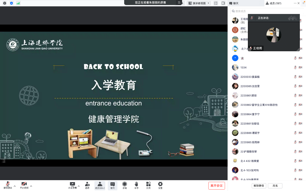为使新同学能更好的适应大学生活,更加详细的了解学院,更加深刻的认识校纪校规,时刻注意自身安全,健康管理学院于2022年10月9日晚举行了新生入学教育系列专题讲座,内容主要包括:社区、评奖评优、资助、征兵、学生社团等。出席本次讲座的有健康管理学院党总支副书记孙俊芳老师,分团委书记李倩文老师,党总支组织委员王培雨老师,辅导员卞浩老师、朱丽丽老师、胡虹老师、唐瑜老师以及全体22级健康管理学院新生。 本次讲座由新生辅导员朱丽丽老师主持。 首先,王培雨老师介绍了学院党建工作和评奖评优。王培雨老师以入党的意义为切入点为大家介绍了大学生入党的流程。同时介绍了与同学们学习生活息息相关的评奖评优,上海建桥学院的奖学金与荣誉的类型与评选条件。 其次,李倩文老师介绍了健康管理学院分团委学生会以及白衣天使社、院心协等学生组织,向同学们展示了学院各学生组织的风采,并鼓励同学们积极加入分团委学生会、白衣天使社以及院心协等学生组织,丰富大学生活,为自己的大学生活增添一份收获。 接下来,唐瑜老师给大家介绍了学校社区的管理要求,日常工作,自管会,三级建家、雷锋志愿者服务队,着重强调了宿舍卫生及用水用电安全。 最后,卞