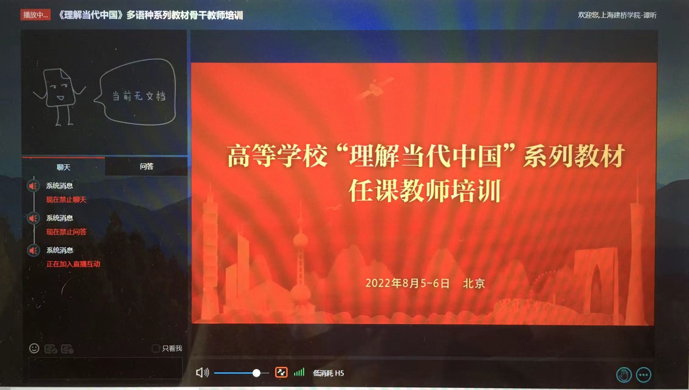 为全面推进《习近平谈治国理政》多语种版本进高校进教材进课堂工作,中央宣传部、教育部组织编写了《理解当代中国》多语种系列教材,计划于2022年秋季学期面向全国普通本科高校外国语言文学类专业本科生、研究生和语言类专业留学生推广使用。为帮助各高校任课教师准确把握教材主要精神和重点内容,北京外国语大学、外语教学与研究出版社、全国高校教师网络培训中心经商中央宣传部国际传播局,通过全国高校教师网络培训平台于2022年8月5日-6日开展了全国高校任课教师的线上集中培训。上海建桥学院外国语学院日语系响应上级号召,积极组织日语专业相关任课老师参加本次培训。日语系主任刘尔瑟以及日语系教师李熙颖、郑玲玲、潘小宁、周杨利用假期时间,全程参与了本次培训,围绕《习近平谈治国理政》多语种版本“三进”工作总体要求,深入学习了习近平新时代中国特色社会主义思想,并系统学习了《理解当代中国》日语系列教材的整体理念、教学要求和教学示范等。8月5日,中宣部国际传播局陈雪亮副局长、教育部高等教育司武世兴副司长、北京外国语大学杨丹校长分别于开班仪式上致辞。教育部高等学校外国语言文学类专业教学指导委员会主任孙有中教授围绕《理解当代中
