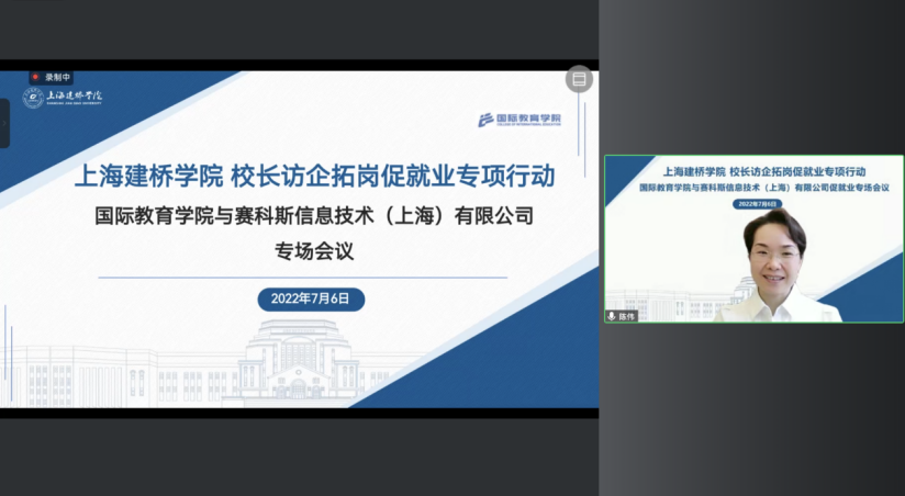 为贯彻落实党中央、国务院“稳就业”、“保就业”决策部署,积极响应学校号召,持续推进学院毕业生就业工作,7月6日下午,国际教育学院召开校长访企拓岗促就业专项行动——赛科斯信息技术(上海)有限公司专场会议。陈伟副校长,国际教育学院院长梁月泉、党总支书记周英芬、副院长刘潇滢、党总支副书记高祺、日语教学中心主任杨晓兴、网络工程专业副主任王瑞、院办主任张文静及相关专业辅导员,赛科斯信息技术(上海)有限公司人事部经理张佳胤、人事部招聘主管左聪参加会议。会议由党总支书记周英芬主持。陈伟副校长对赛科斯信息技术(上海)有限公司一直以来对于我校人才培养及就业工作给予的大力支持表示衷心感谢,并介绍了我校办学历史、办学理念、应用型人才培养特点、ISO质量管理体系、卓越建桥计划以及“十四五”规划目标等,表示学校高度重视产教融合,希望能够进一步推进与赛科斯这样优秀企业的交流与合作。梁月泉院长、刘潇滢副院长、高祺副书记分别就学院总体情况、各专业人才培养情况、2023届各专业毕业生情况等方面进行了详细介绍。赛科斯信息技术(上海)有限公司人事部经理张佳胤、人事部招聘主管左聪介绍了企业规模、业务分布以及岗位人才需求,并介