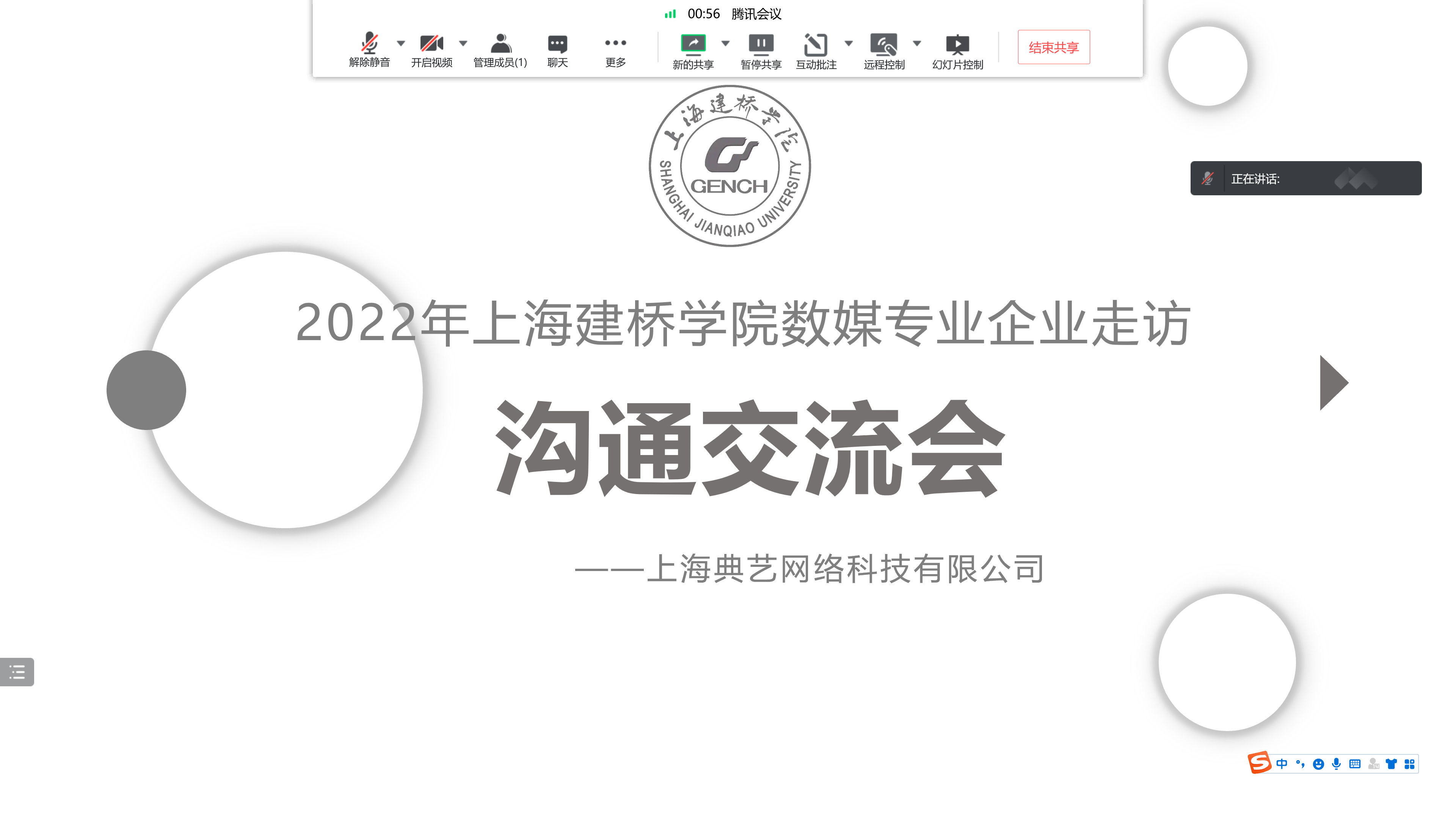 为进一步做好疫情防控常态化背景下的学生就业工作,加强与用人单位联系与交流,拓展就业资源及产教融合,4月26日,信息技术学院数字媒体技术系在校、院两级领导的带领下“云走访”上海典艺网络科技有限公司,与企业相关领导及实习生进行了线上交流对话,双方就毕业生表现、企业对学校教学改进建议,校企双方在深化产教融合等方面进行了深度交流探讨。在此次线上交流中,副校长杨俊和教授介绍了当下整个毕业季的就业形势,介绍了政府、学校等各级部门近期的就业推进工作,在产教融合方面向企业介绍了相关的政策,欢迎企业走进学校,与相关专业在人才培养、实践、就业等各方面进行深入的合作。作为数媒专业校企合作单位,典艺总经理助理、人事总监韩竹惠女士向大家介绍了近年来双方合作的情况,目前在职7人,累计就业人数达26人次,随着不断的深入合作,在实践课程、毕业实习指导、毕业设计指导等方面都形成了较好的合作基础,韩女士希望在后期的合作中学校能够继续支持企业,能够通过合作共建课程群的教学平台、共同完成实践教学等形式来培养企业所需求的人才。会上,信息技术学院院长张文俊教授感谢了企业近年来在教学、就业等工作上对学院的支持,典艺多次参与学院就业