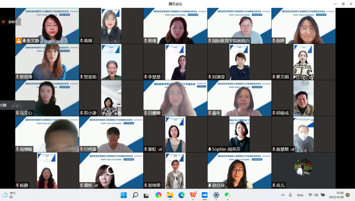 为积极响应市委“动态清零”总方针,打好疫情攻坚战,提升教师使命感、责任感,同时持续推进2022届就业工作,国际教育学院于4月28日下午在线上召开了“同心抗疫 国教有你——国际教育学院教职工疫情防控工作会暨就业动员会”,学院领导班子、教职工全员出席,会议由院办主任张文静主持。会上,党总支书记周英芬先就近期学校疫情防控工作会议的重要精神做了传达。全院教职工应杜绝高校防疫工作出现的“四种风险”,坚持“动态清零”总方针不动摇,通过教师做好学生工作,同时也号召党员教师加入校内疫情防控工作。所有教师都应关注学校准封闭管理情况,目前已经进入到了疫情攻坚的紧要关头,大家要凝心聚力,齐心协力,统一服从领导,守护好家人、师生、校园,打赢这场攻艰战!随后,周英芬书记传达了学校2022届毕业生就业推进会的会议精神与就业工作部署,同时也分析了疫情背景下严峻的就业形势,通报了学院目前的就业进展情况,提出了学校和学院就业目标和工作要求,希望各位老师集思广益、资源共享,“齐心协力战疫情、保就业”。自3月中旬学校转入线上教学以来,学院全体教职工坚守岗位,默默奉献,同心抗疫,构筑了一道道疫情防控网。每个人都尽心竭力,每个