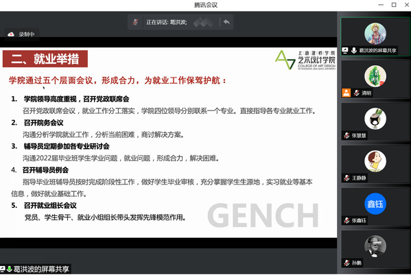 4月14日下午,职业技术学院通过线上平台召开2022届毕业生就业工作推进会,谷伟院长主持并讲话。党委书记王加宁、副院长汤以范、副书记马冯莉出席,全体教职工参加。谷伟院长介绍了目前学院2022届毕业生就业总体进展情况,今年学院毕业人数众多,压力大,受新冠疫情、延毕学生积压等多重因素的影响,当前就业数据与同期相比落后。谷伟院长提出,一是发挥全员力量,要求全体教职工积极发挥作用,共同努力,克服各种困难,齐心协力,携手做好后续就业工作。二是恢复受疫情影响暂停的每周各专业毕业推进会,会上及时通报各类数据,研究制定专业就业任务表,确定时间节点和具体完成任务,并对未就业的学生开展精准就业帮扶。三是各专业主任作为专业就业第一责任人,总体负责本专业具体任务的完成,专业教师负责完成各自所带毕业实习学生的就业工作,辅导员要积极配合专业教师,及时沟通相关数据和具体情况,共同商讨解决困难问题。四是专升本面试名单已出,学工口要和专业主任制定辅导计划,帮助学生面试成功。五是针对专升本笔试,督促学生抓紧复习。六是各专业想方设法,扩展就业资源,特别是校企合作资源和临港地区资源,帮助学生就业。七是学工口要积极主动和学生进